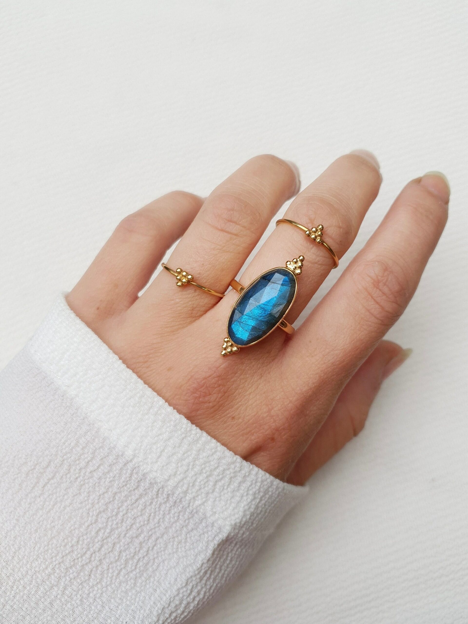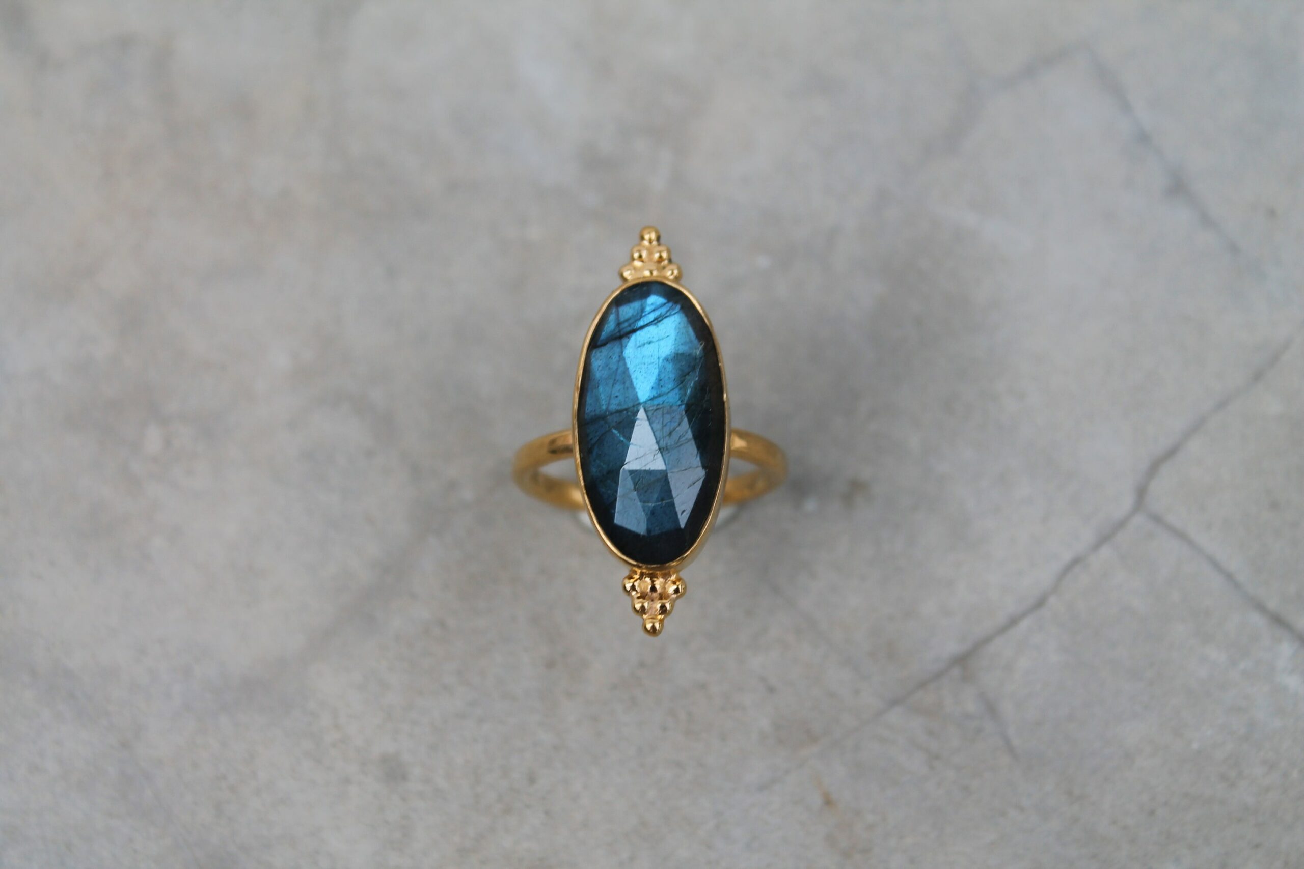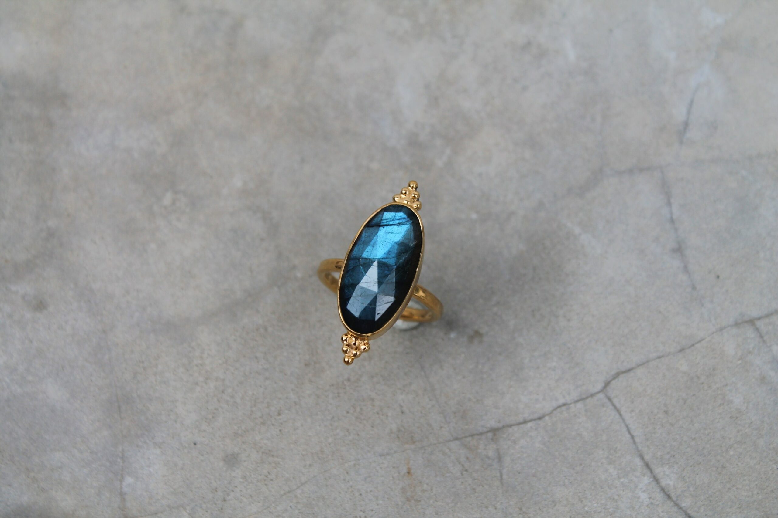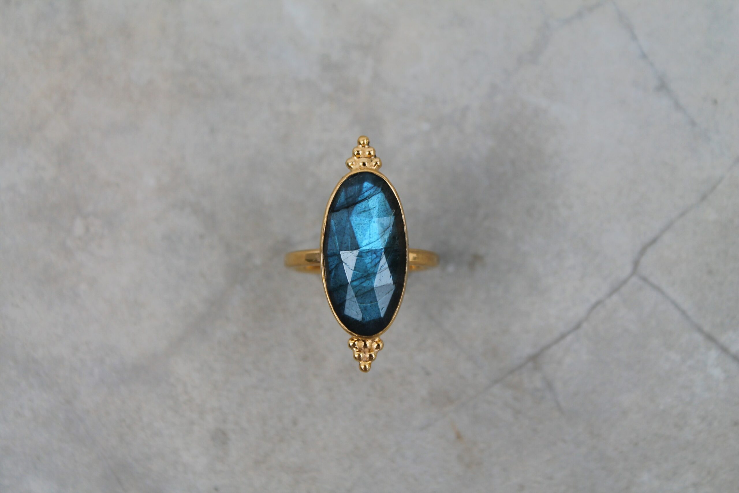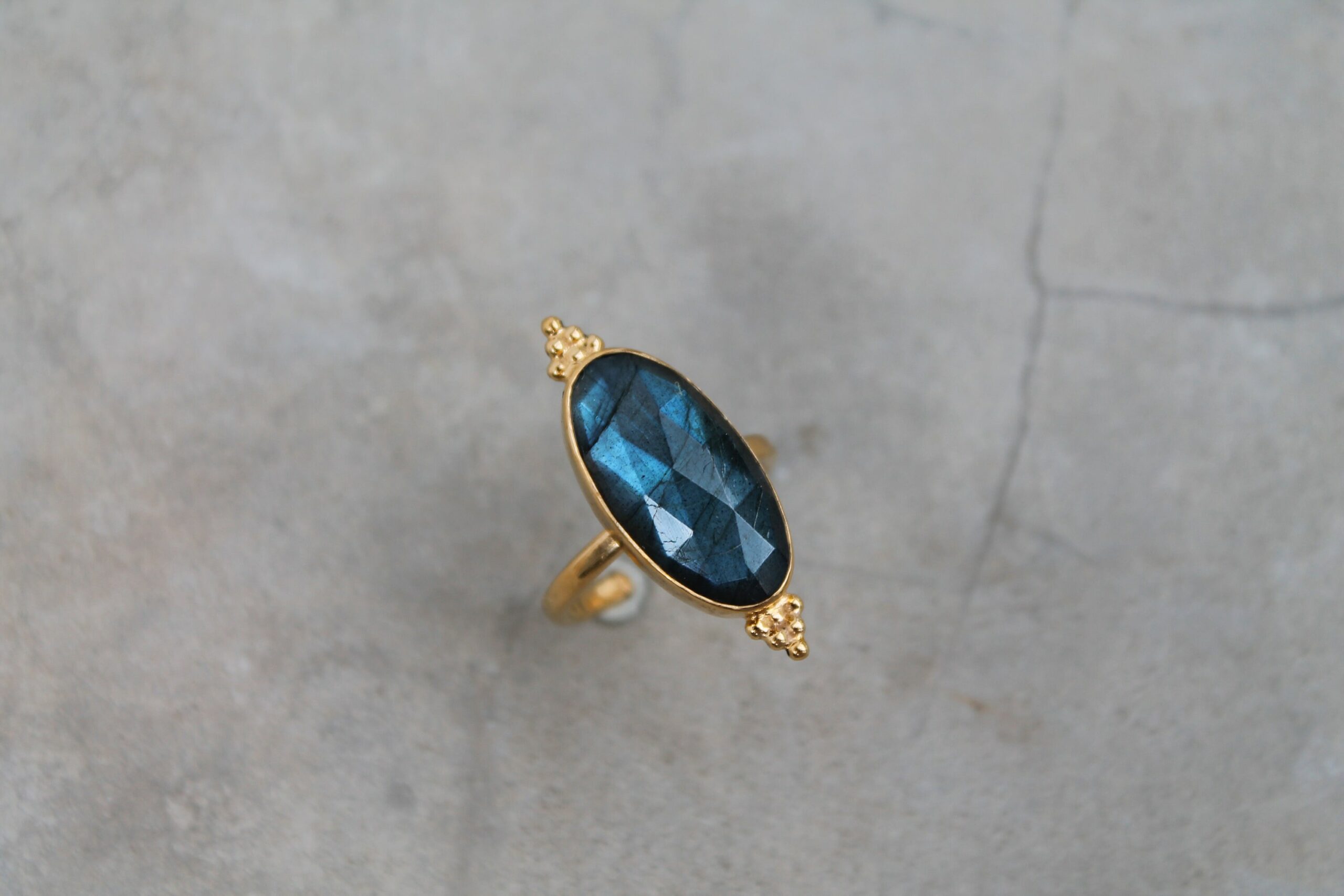 Bague ajustable plaquée or sertie d’une belle labradorite facettée ornée de billes