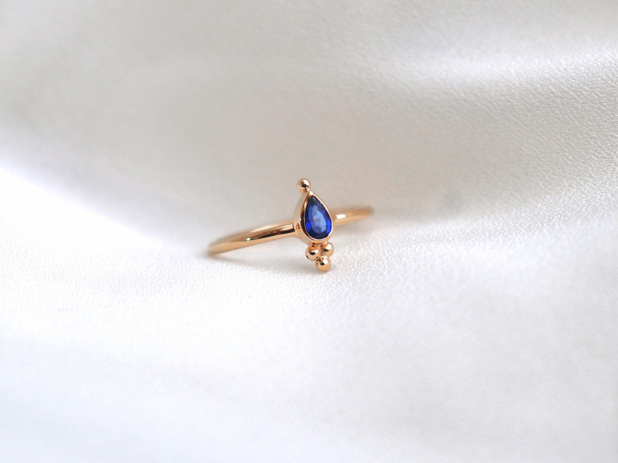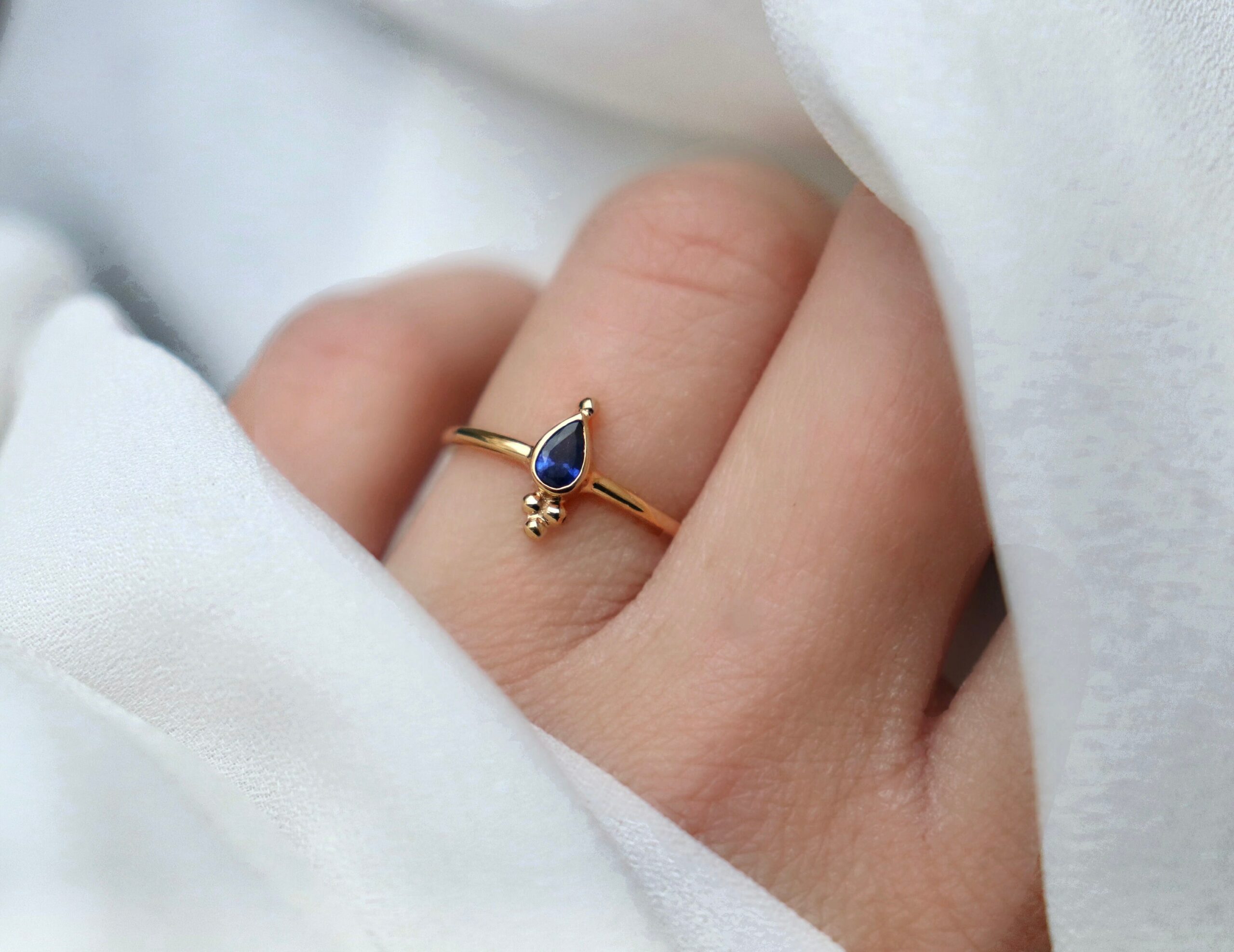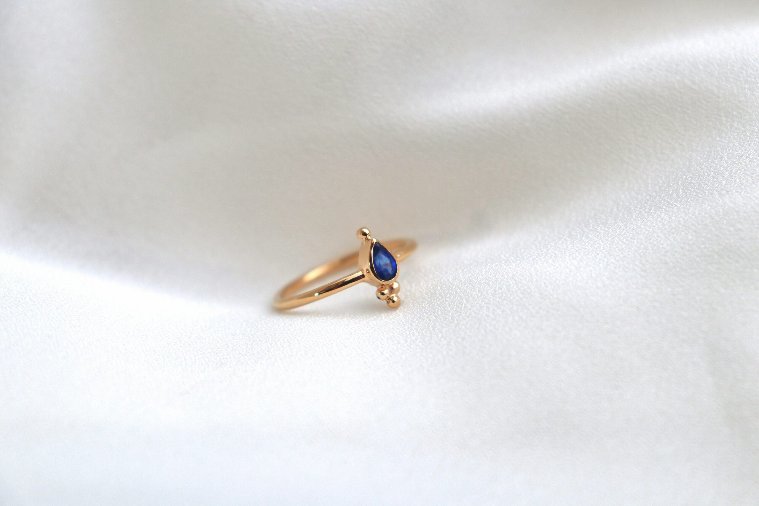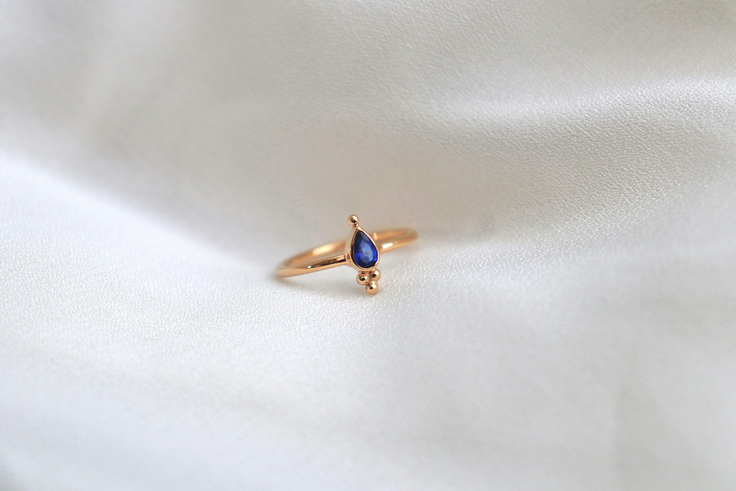 Bague plaquée or sertie d’un beau saphir taillé orné de petites billes.
