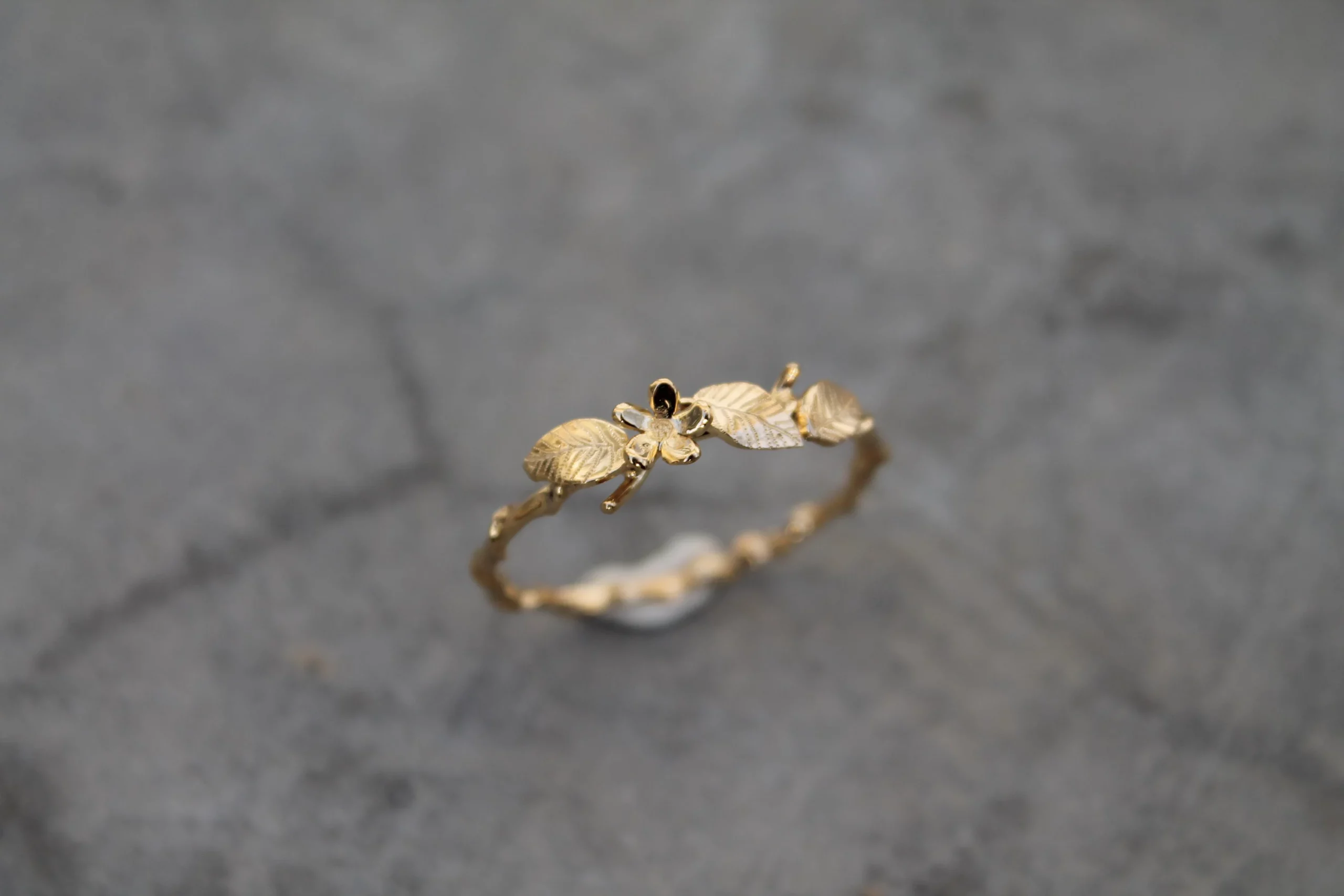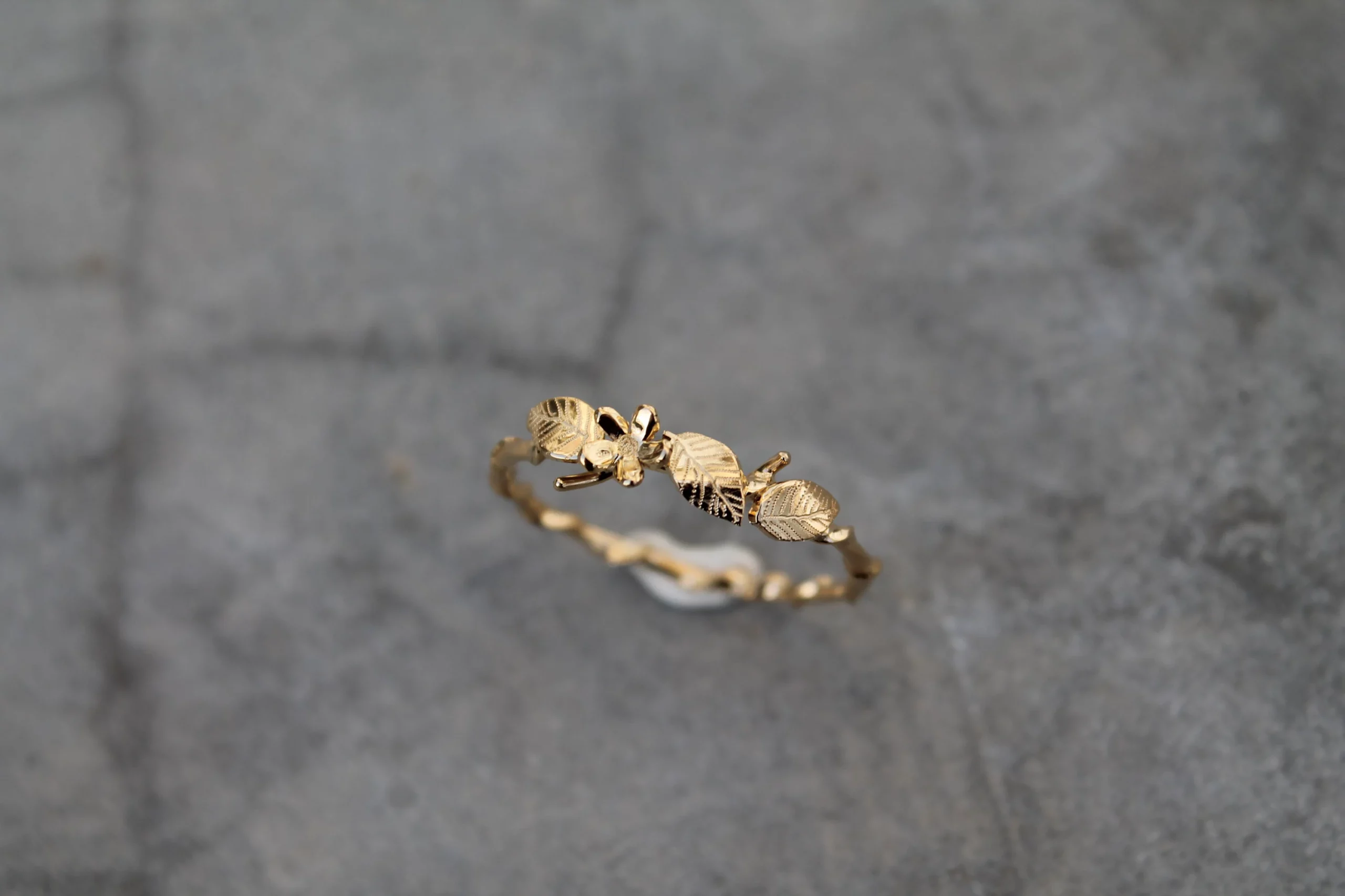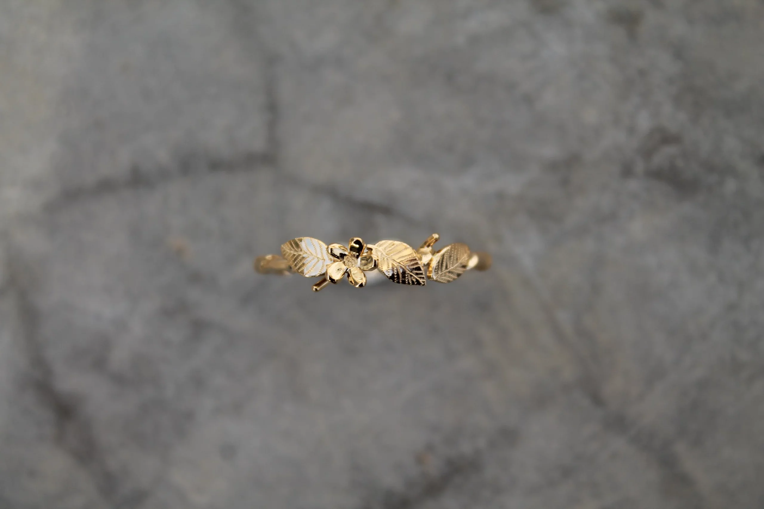 Bague fine plaquée or ornées de feuilles et d’une fleur gravées