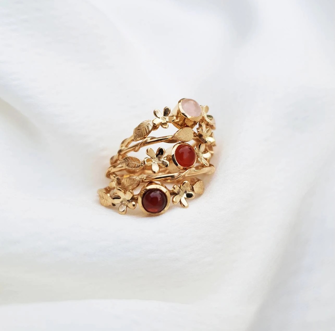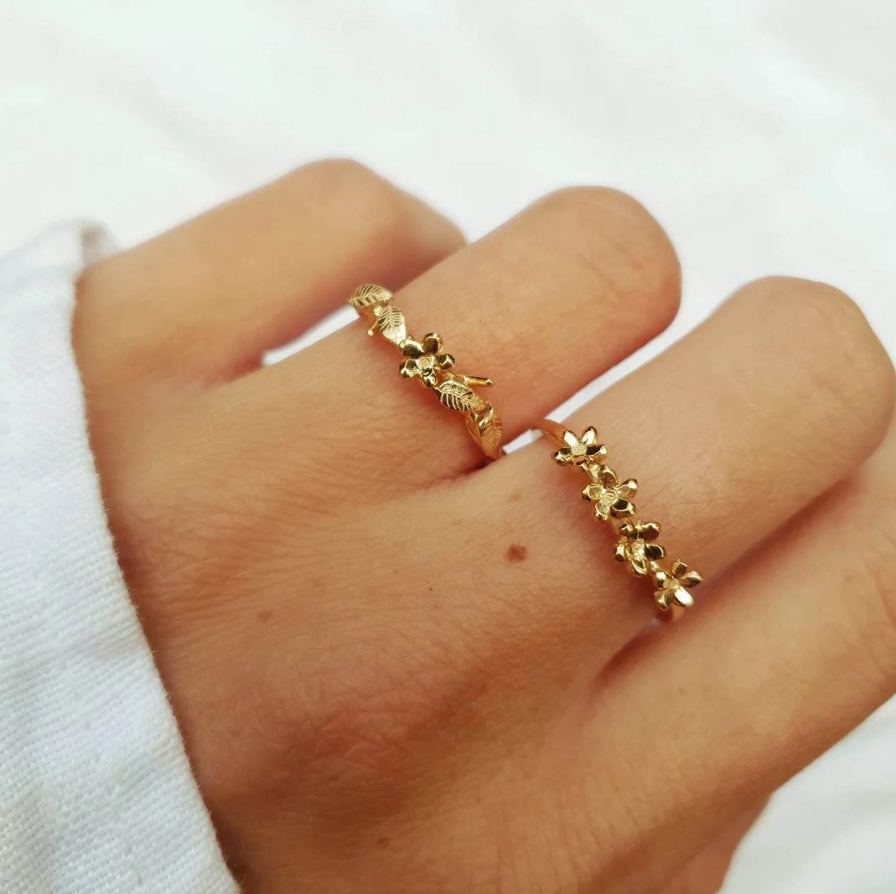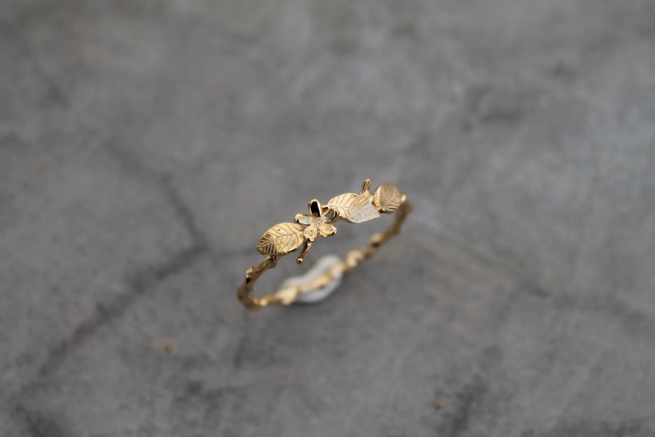 Bague fine plaquée or ornées de feuilles et d’une fleur gravées