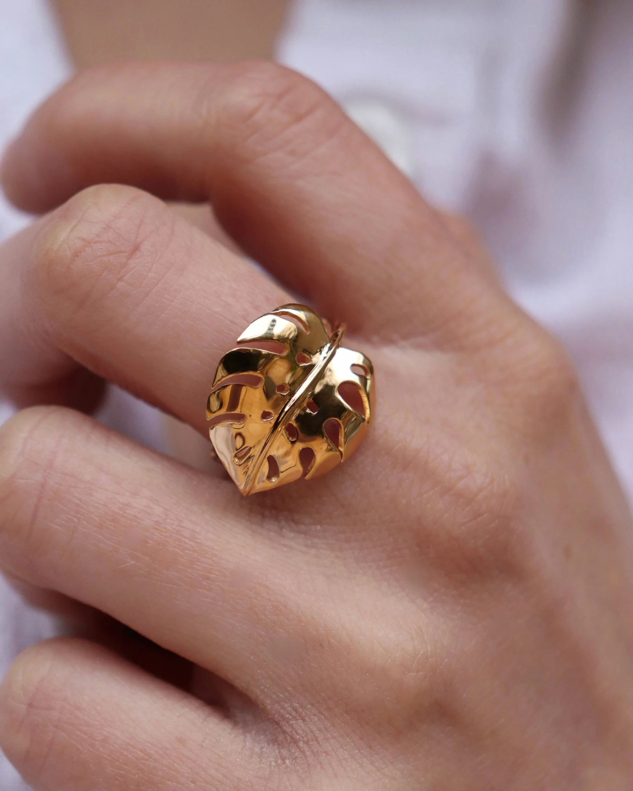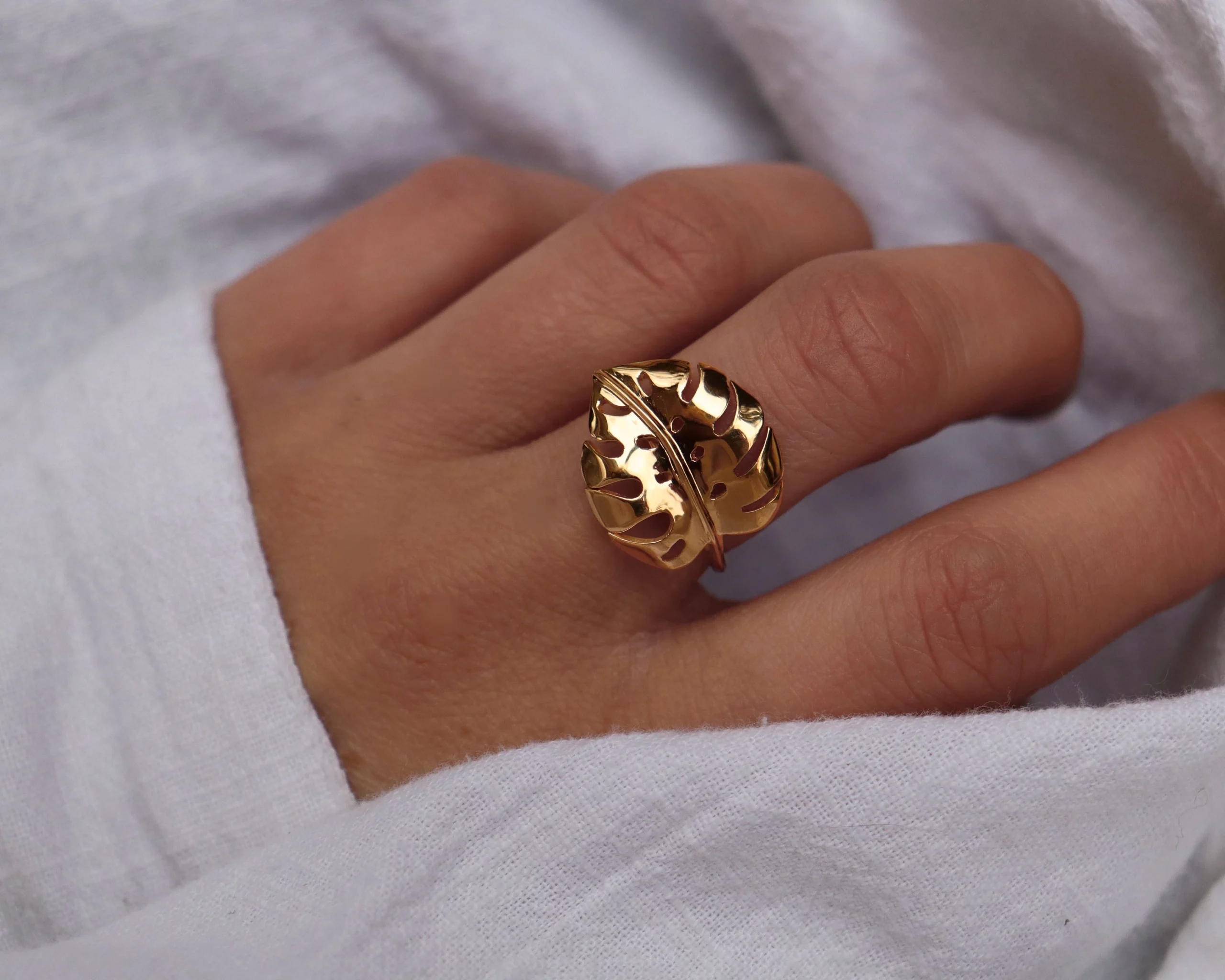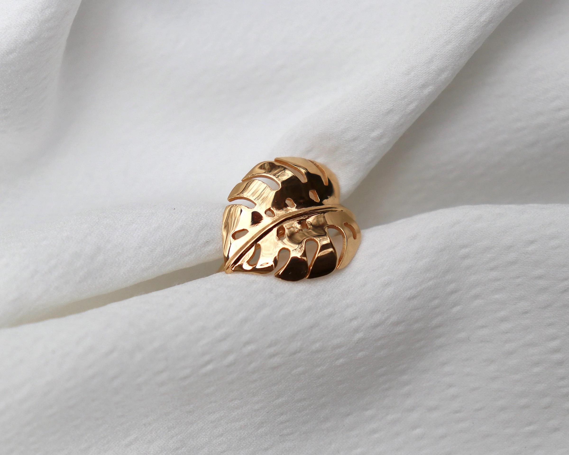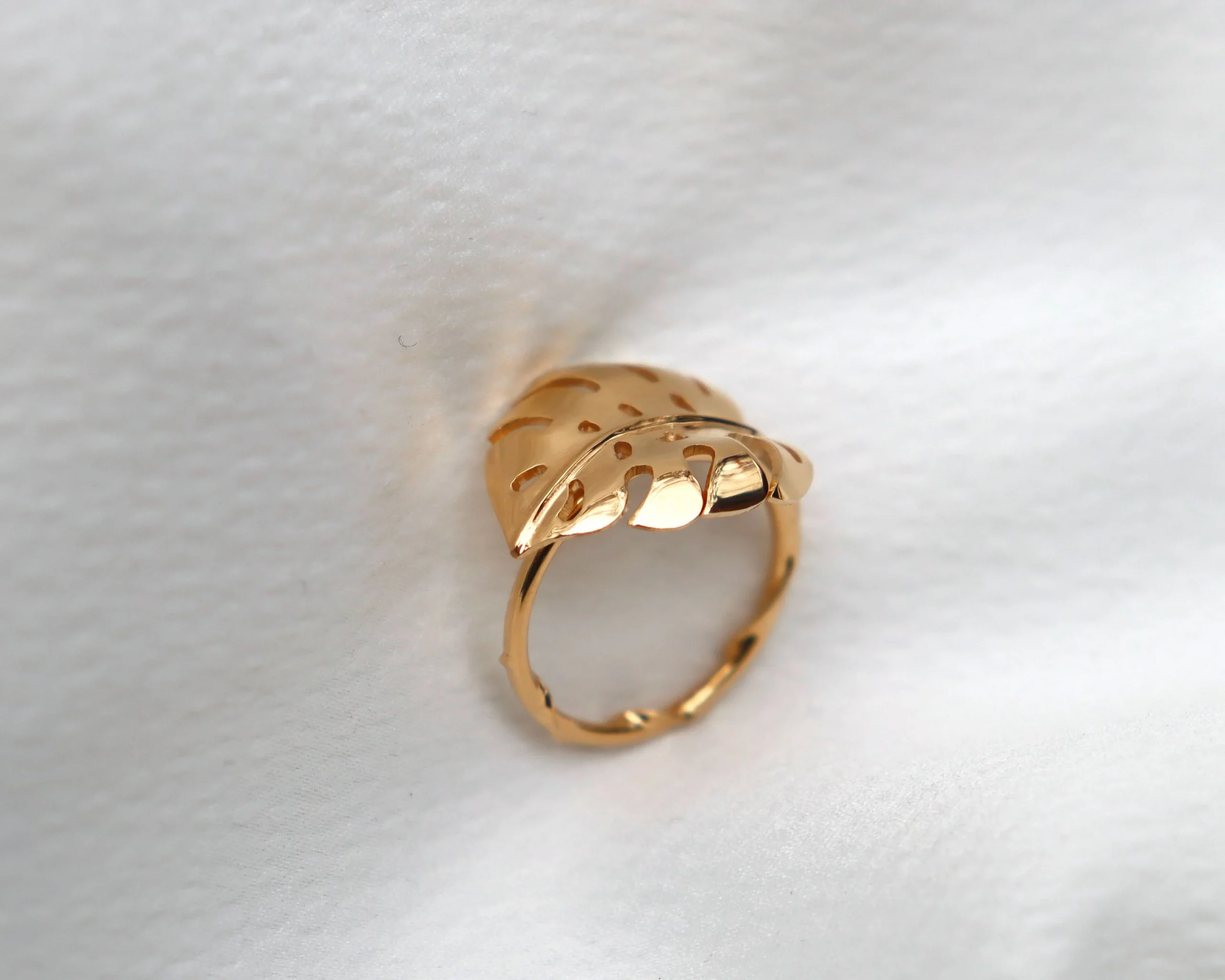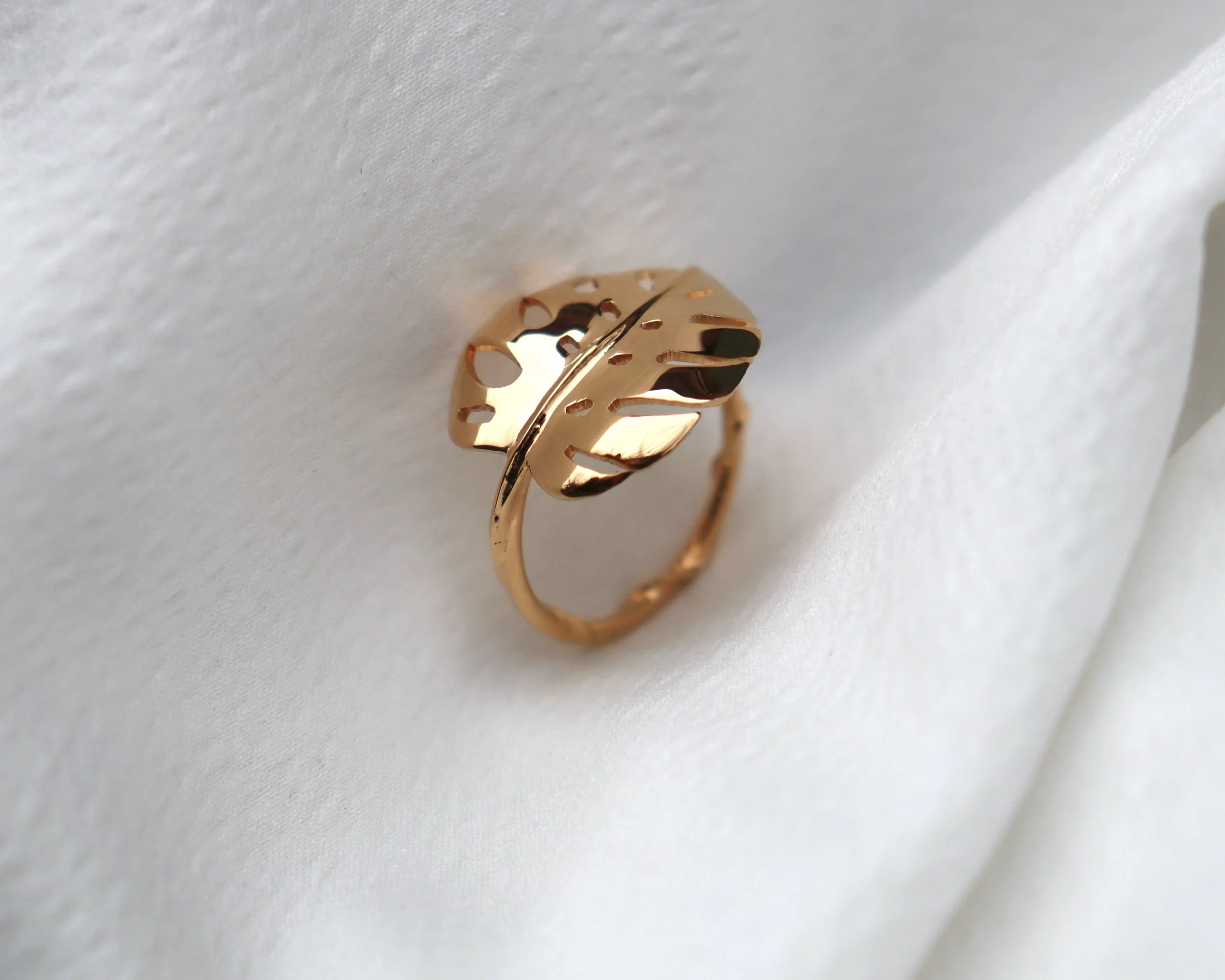 bague plaquée or ornée d’une feuille de monstera deliciosa.