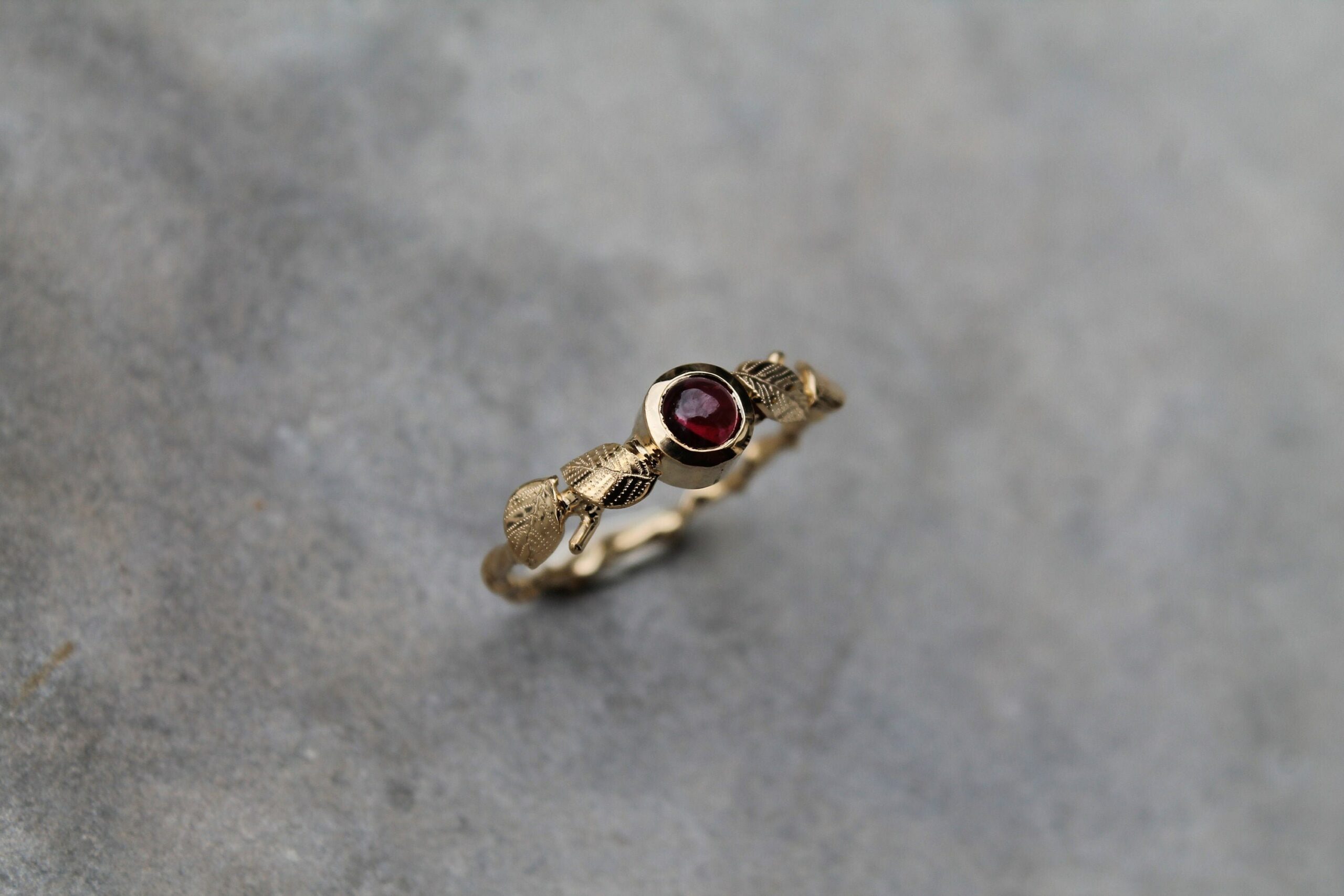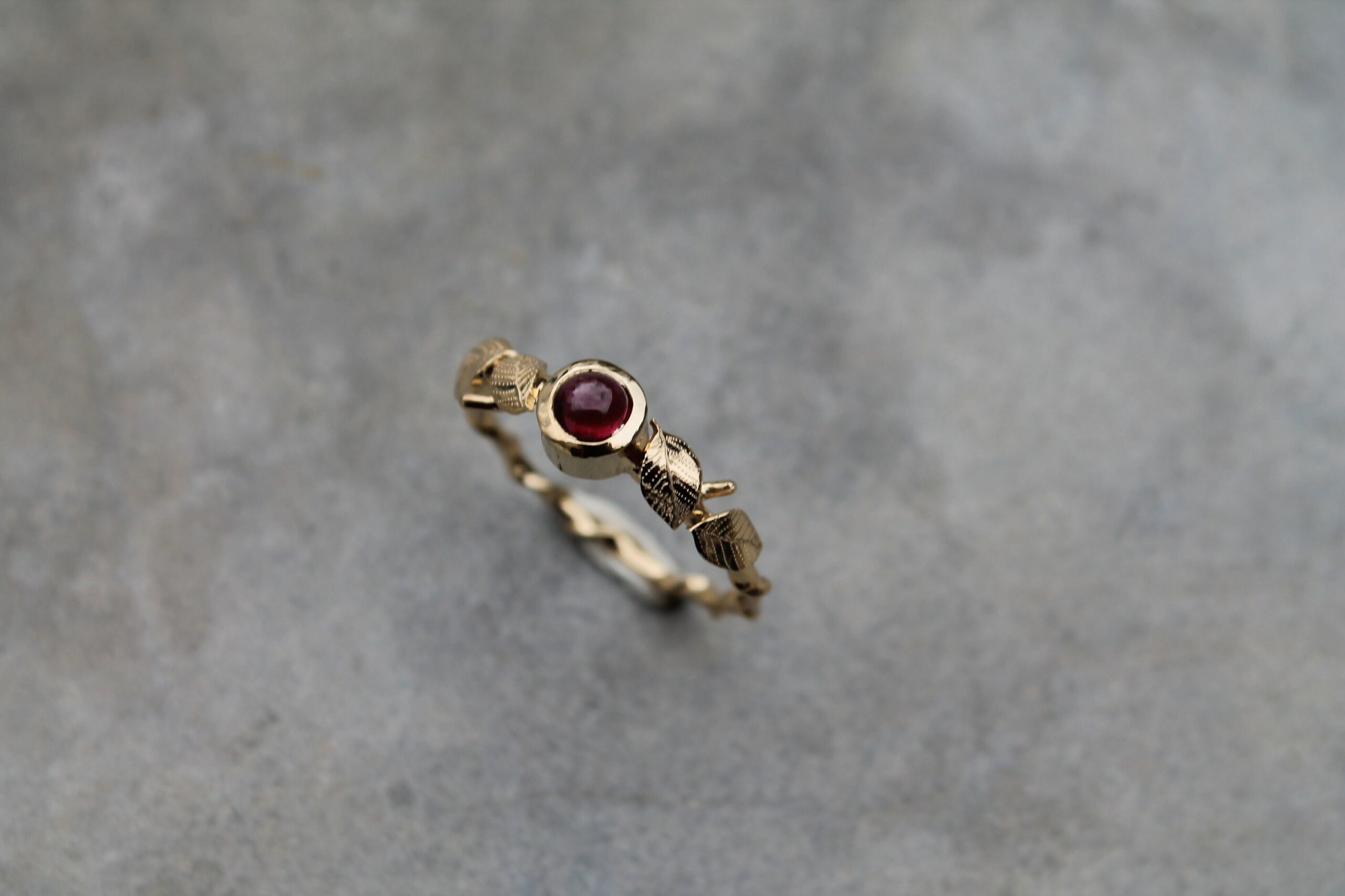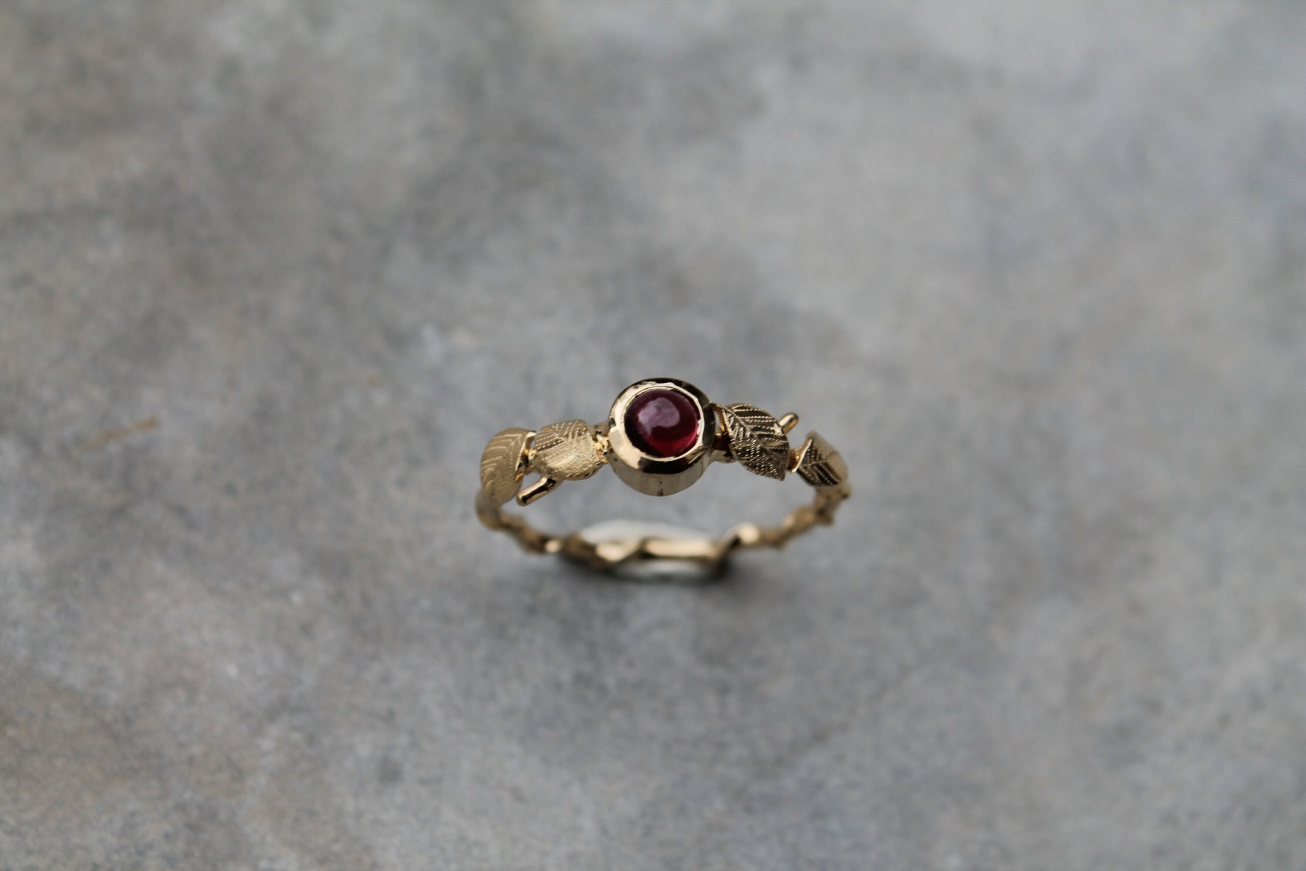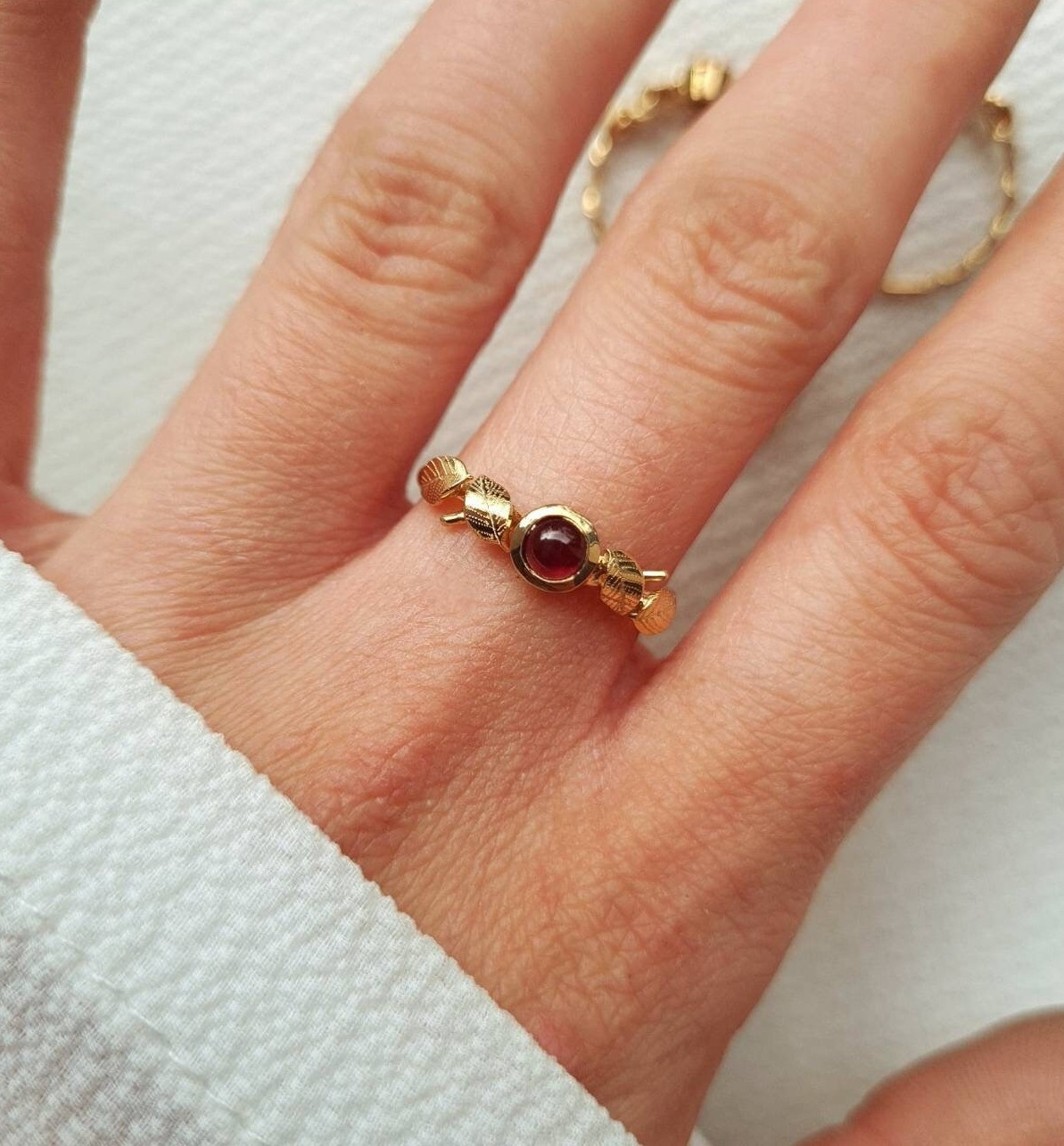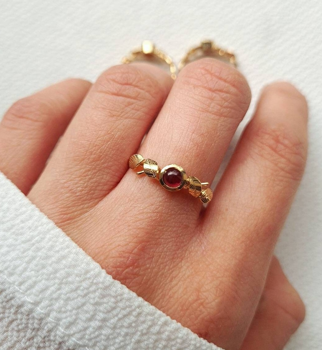 Bague fine plaquée or sertie d’un beau grenat ornée de petites feuilles gravées