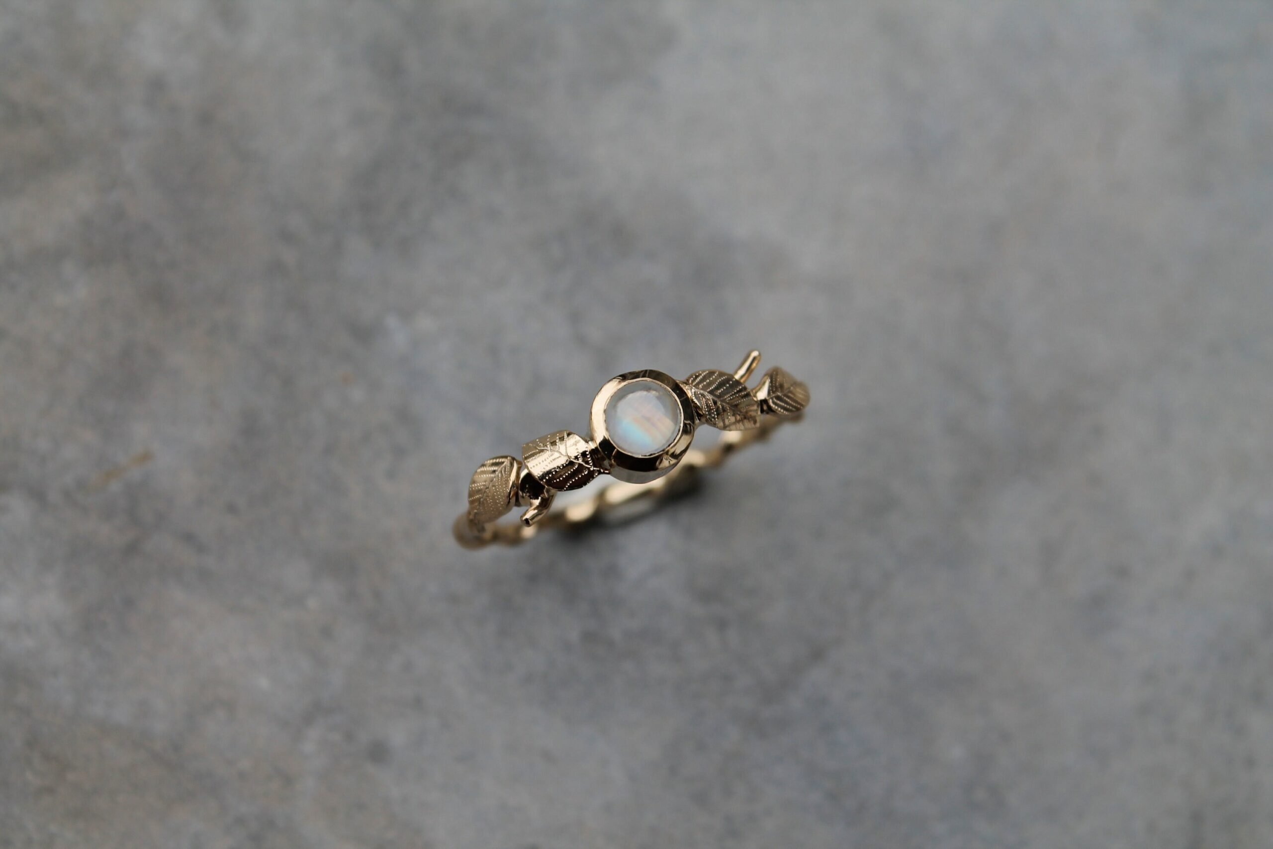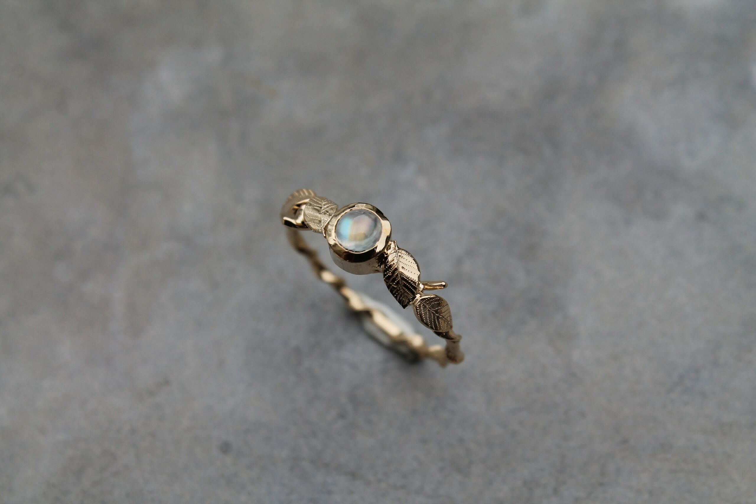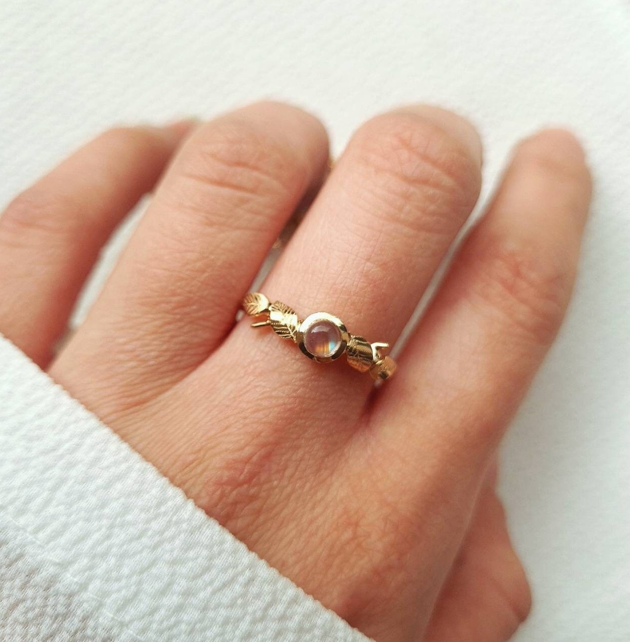 Bague fine plaquée or sertie d’une belle pierre de lune ornée de petites feuilles gravées