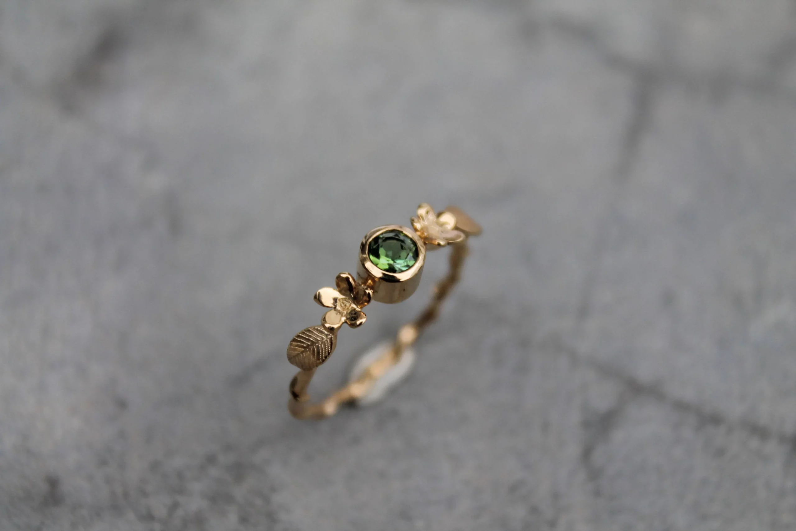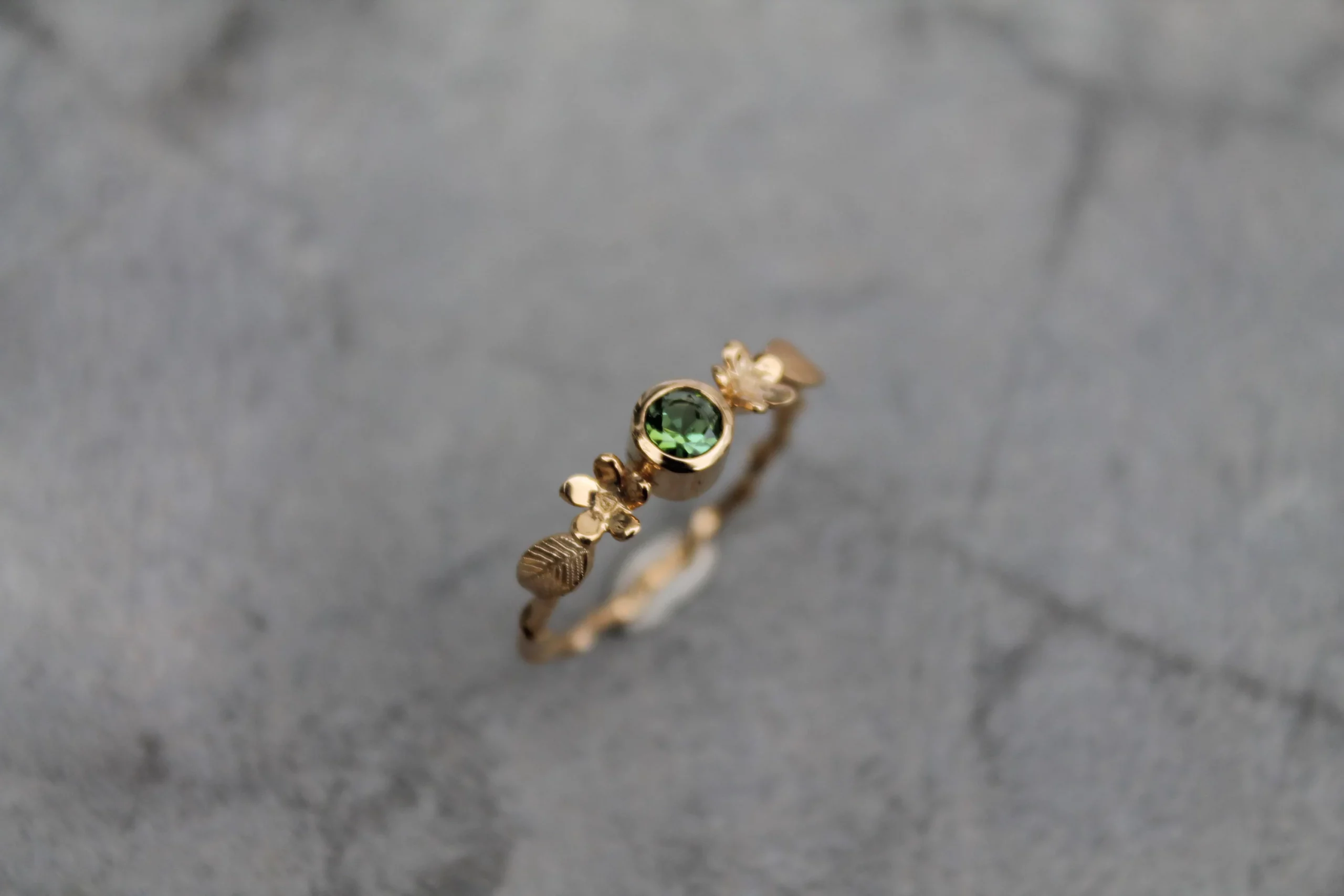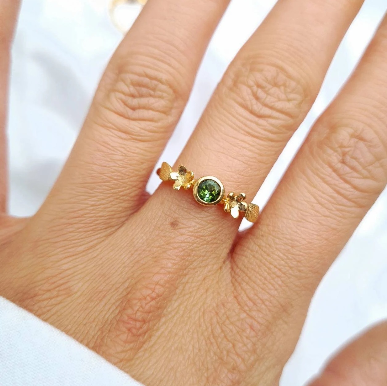 Bague fine plaquée or sertie d’une belle tourmaline verte taillée, ornée de fleurs et de feuilles gravées