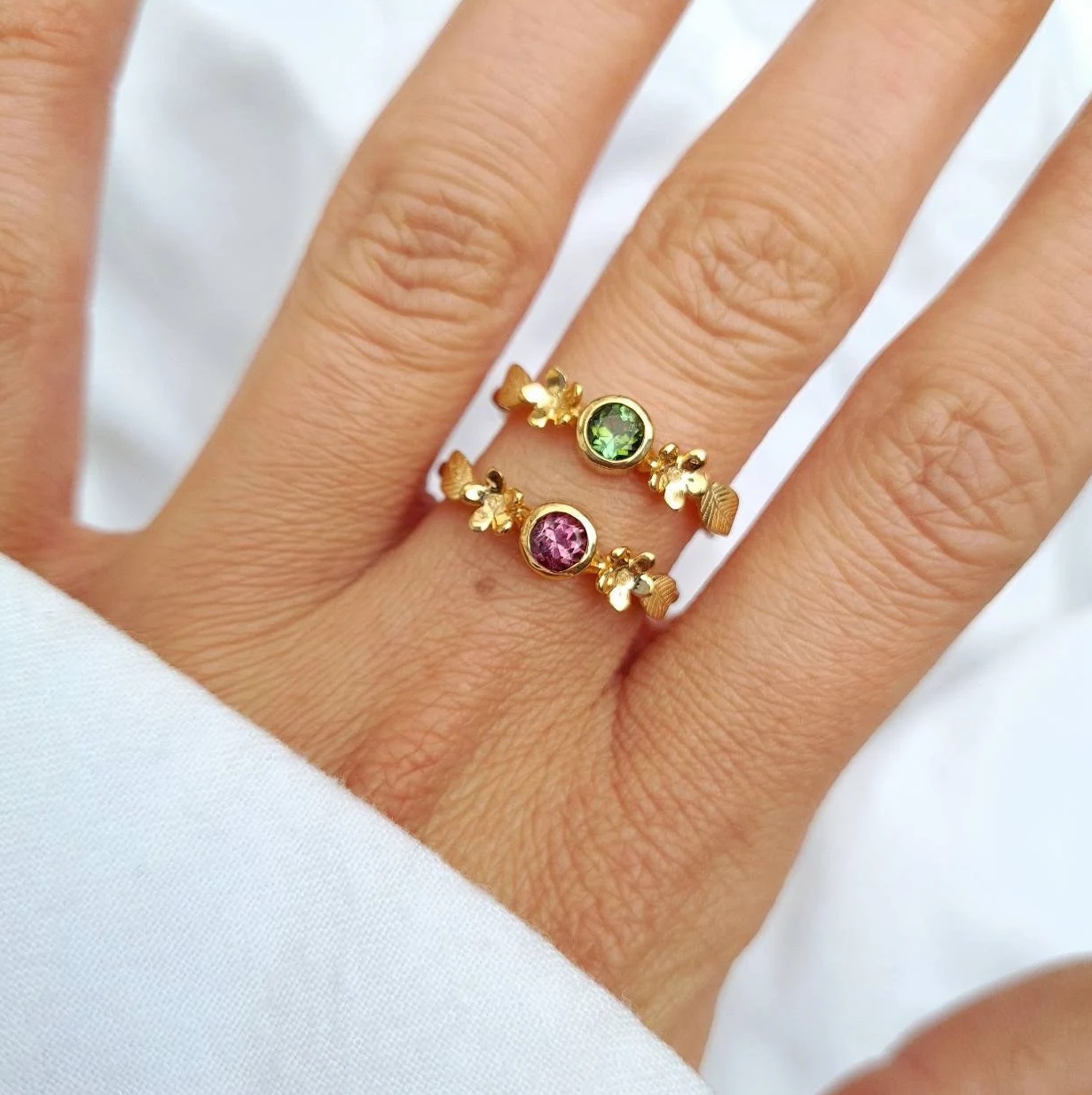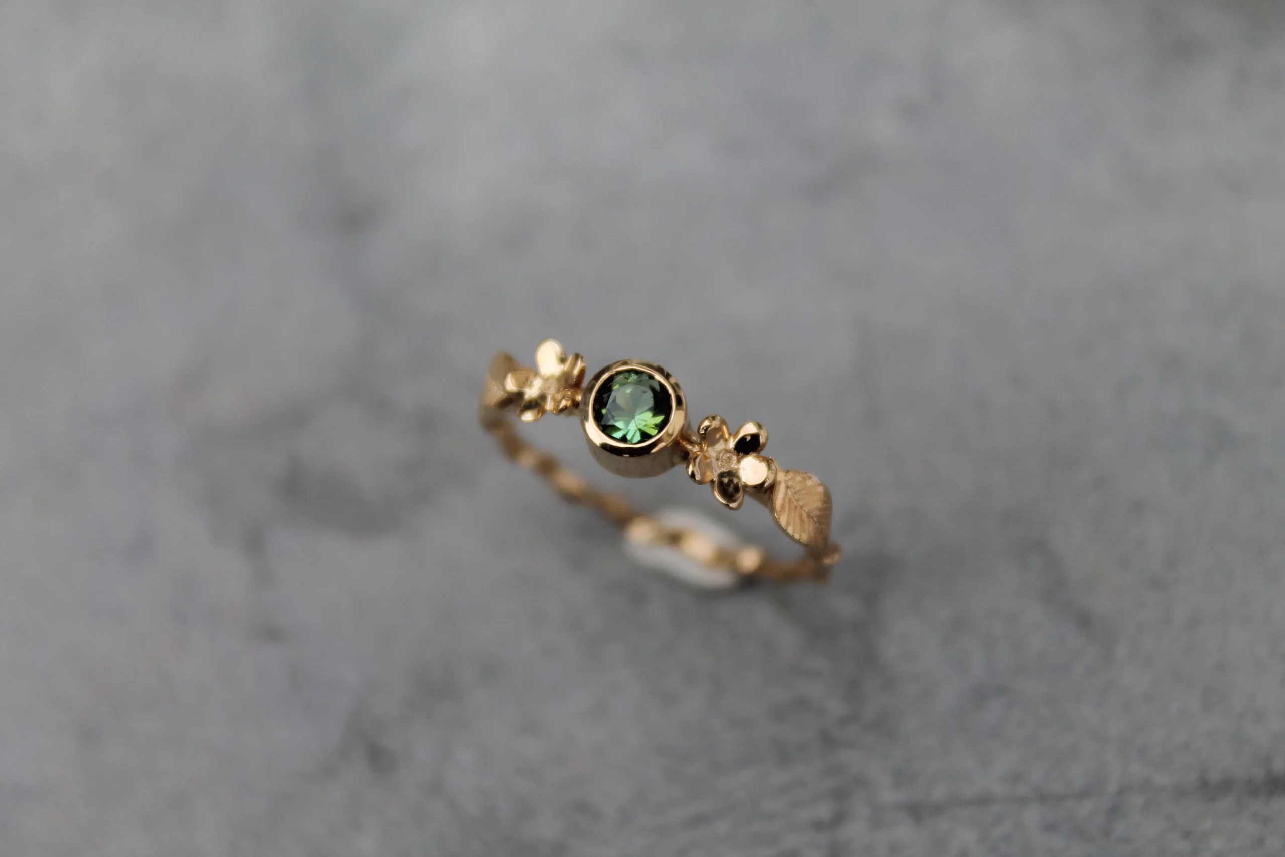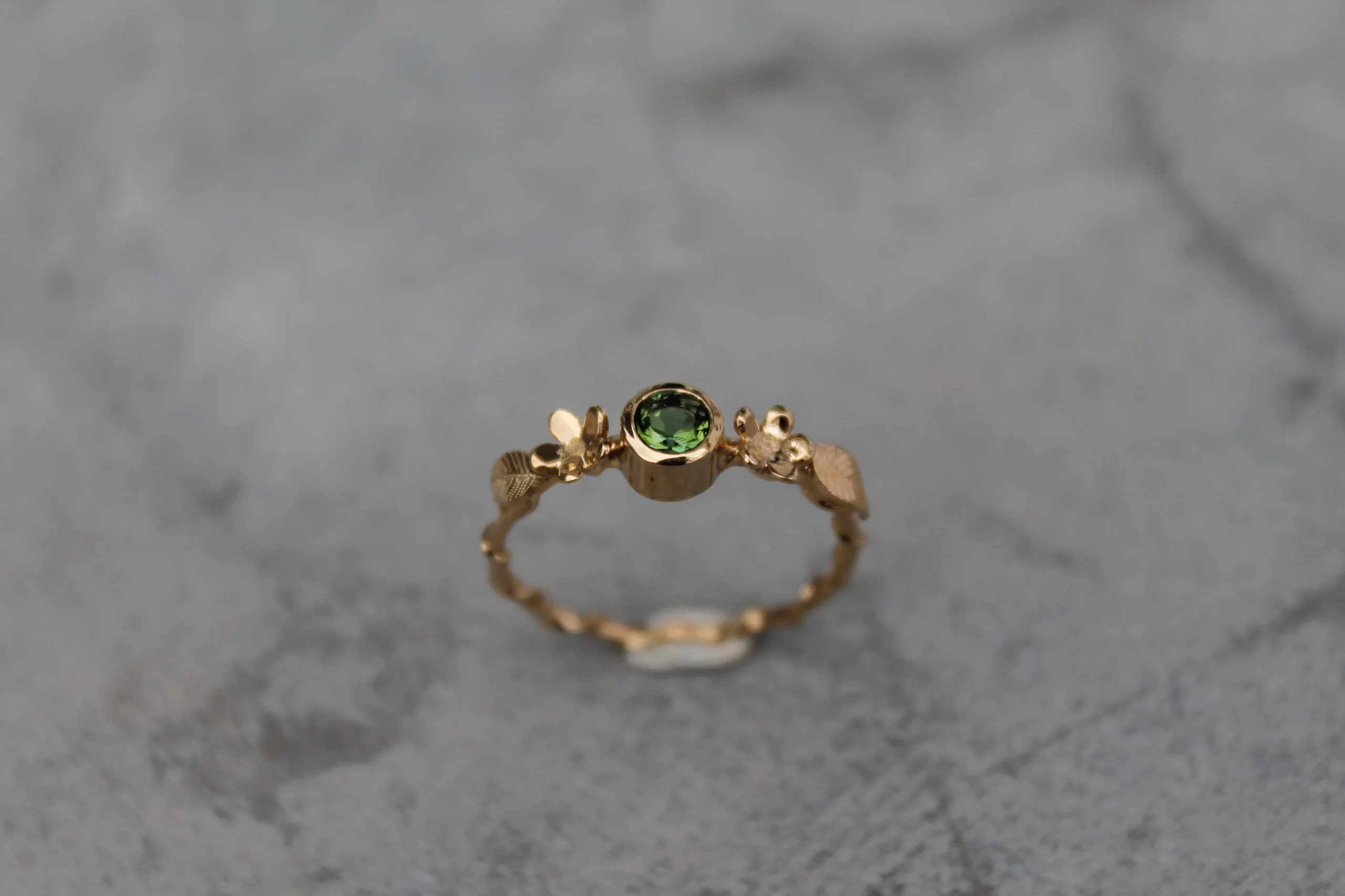 Bague fine plaquée or sertie d’une belle tourmaline verte taillée, ornée de fleurs et de feuilles gravées