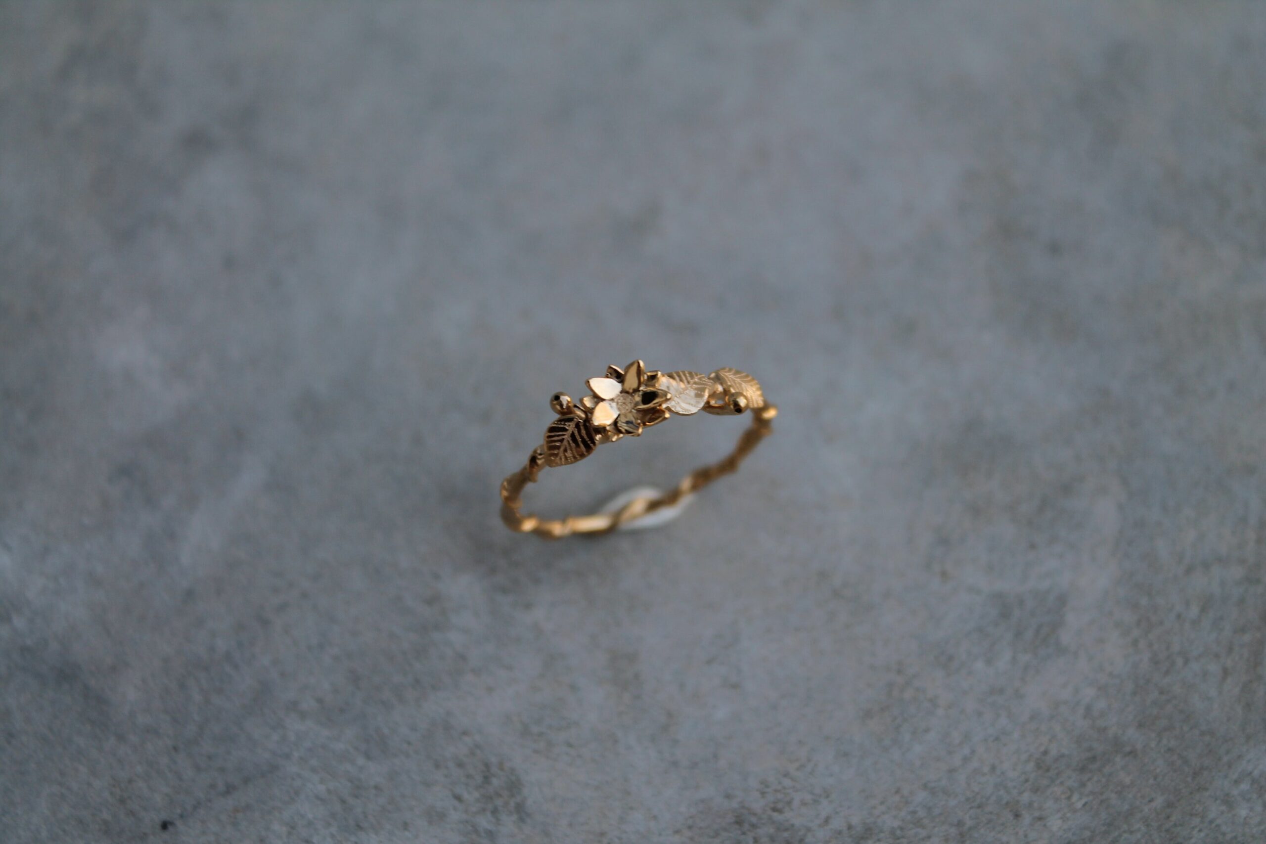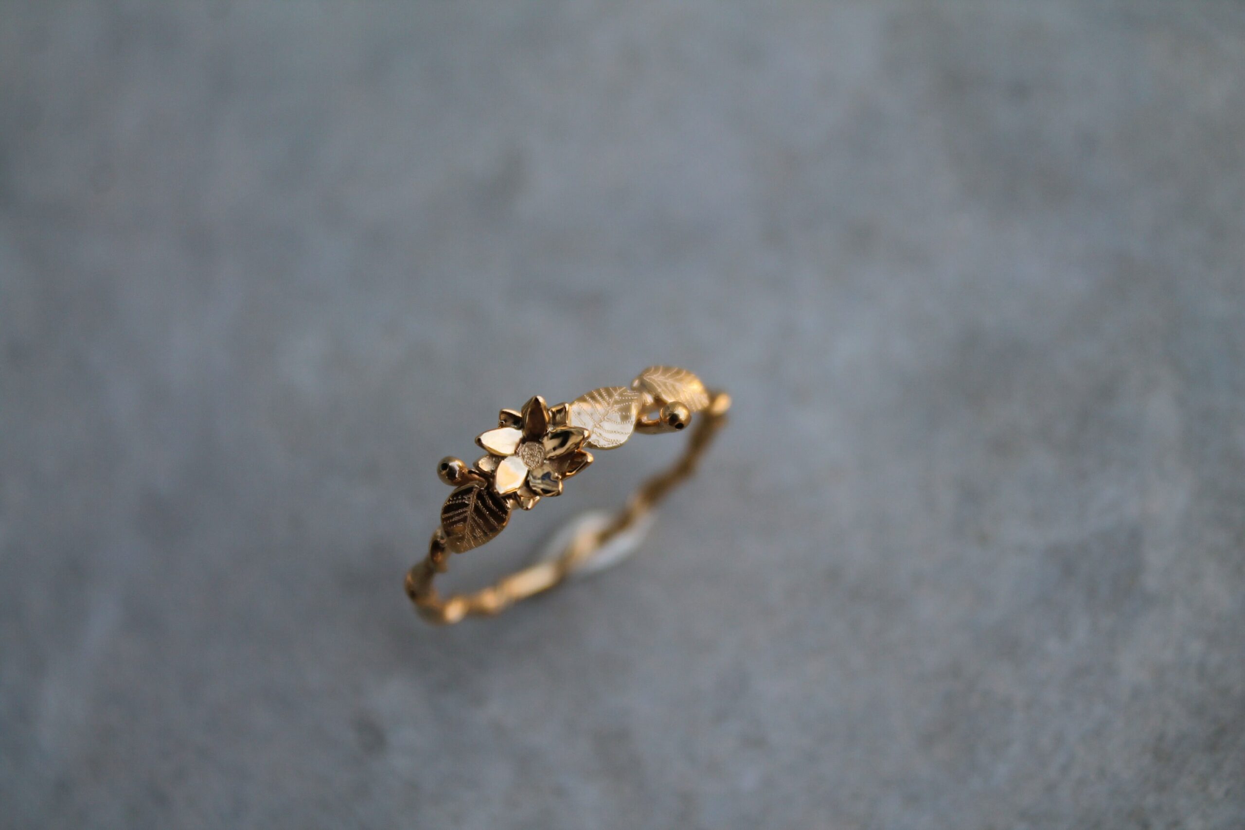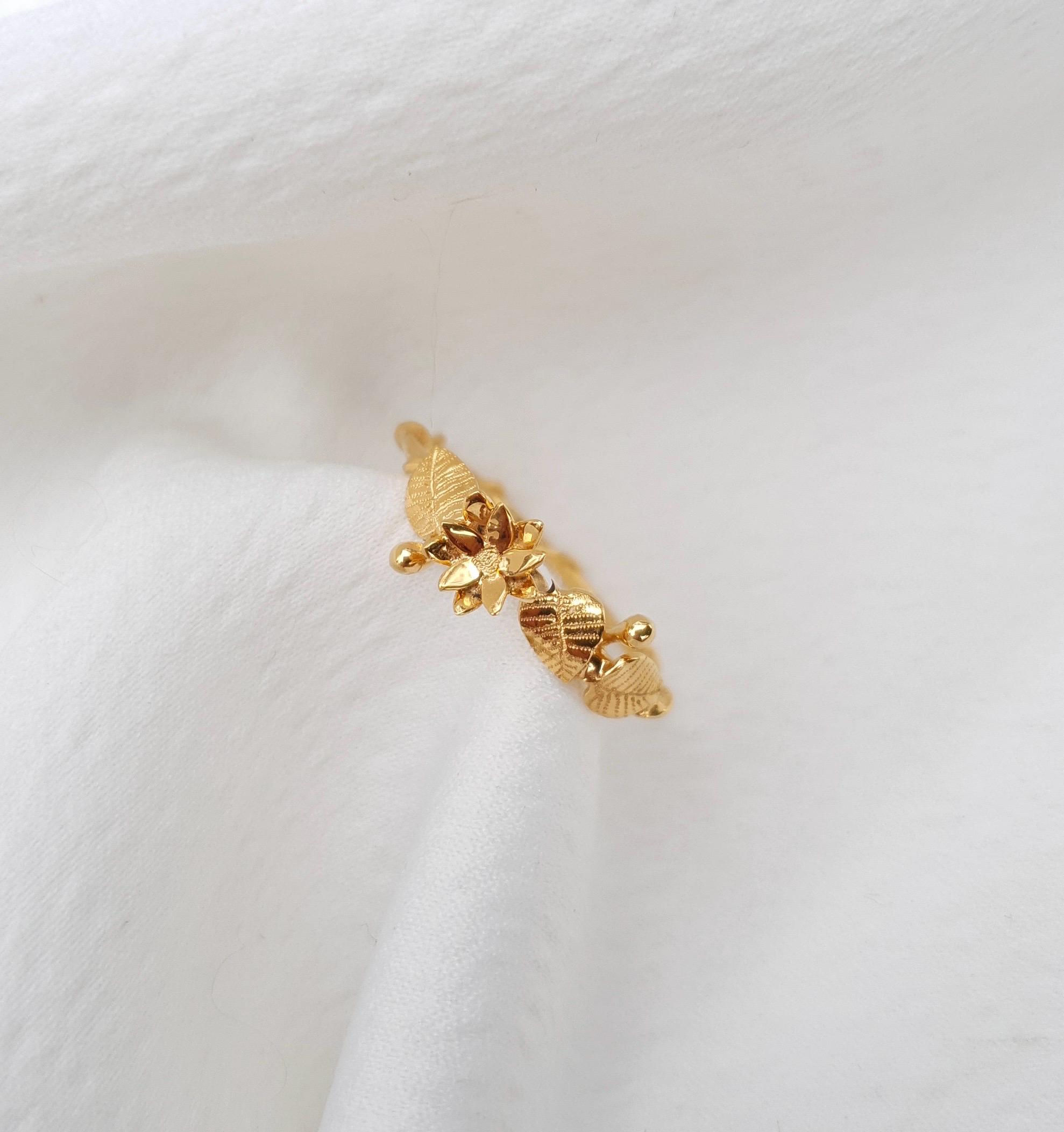 Bague fine plaquée or ornée d’une fleur de lotus et de petites feuilles gravées