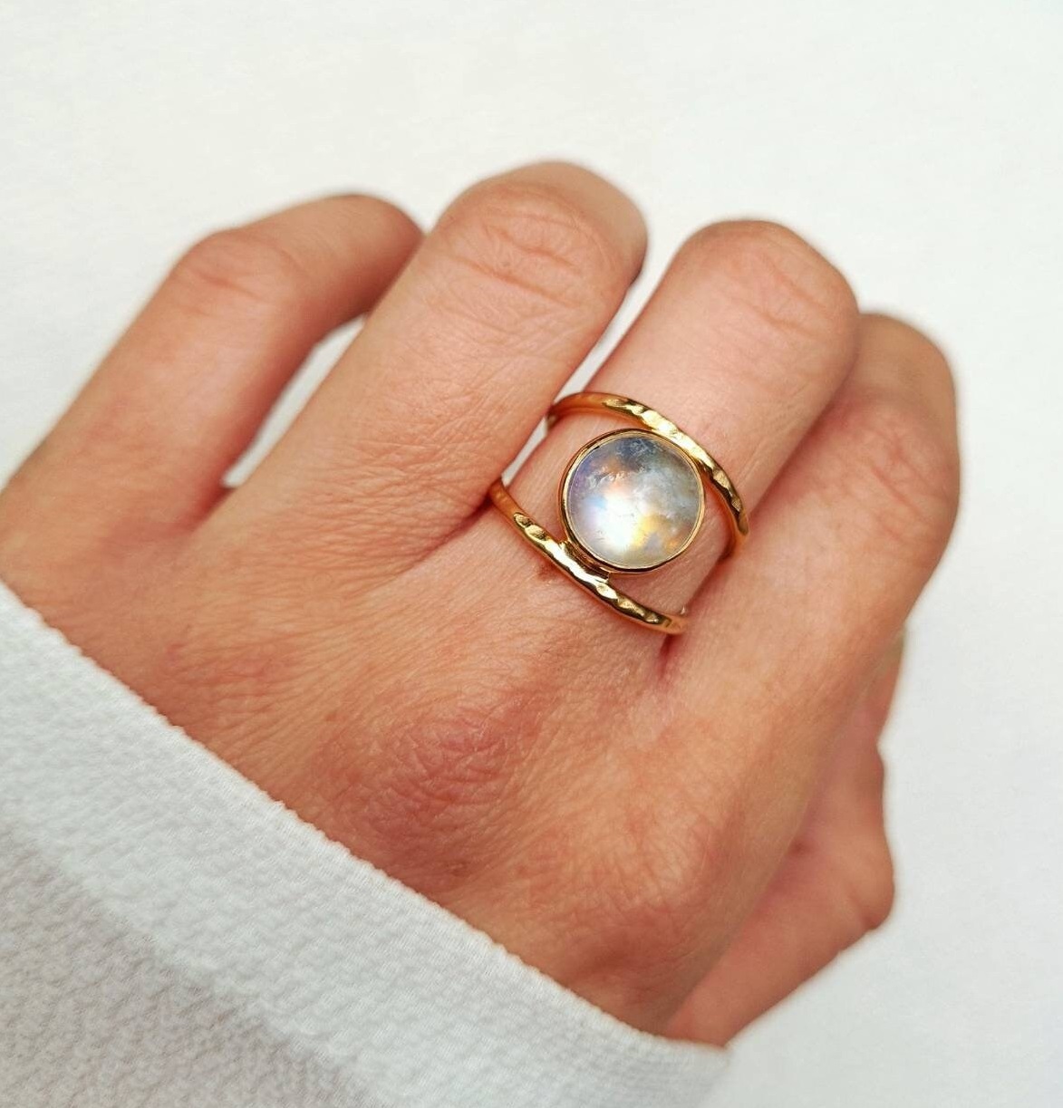Bague ajustable plaquée or et martelée sertie d’une belle pierre de lune en cabochon