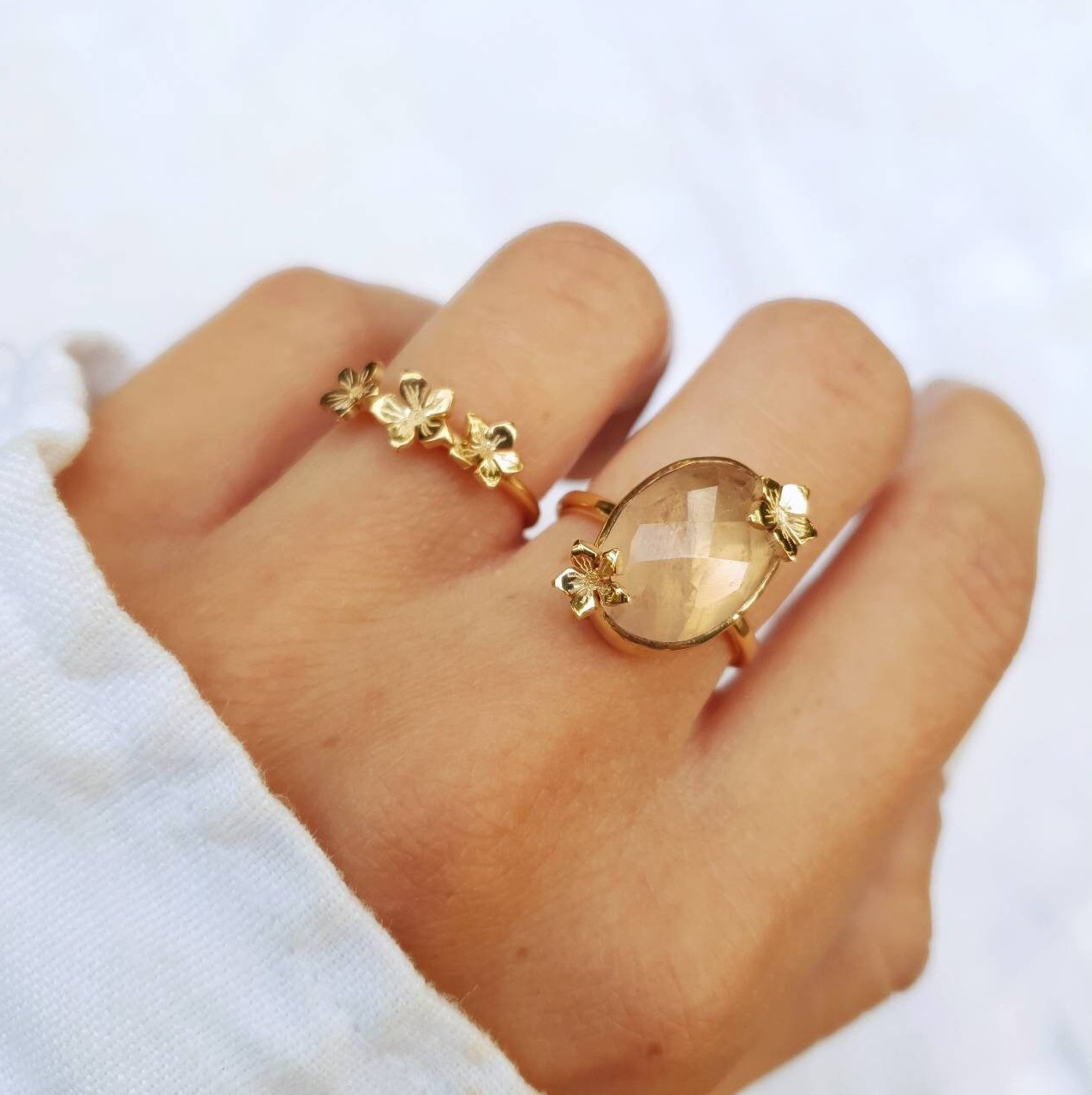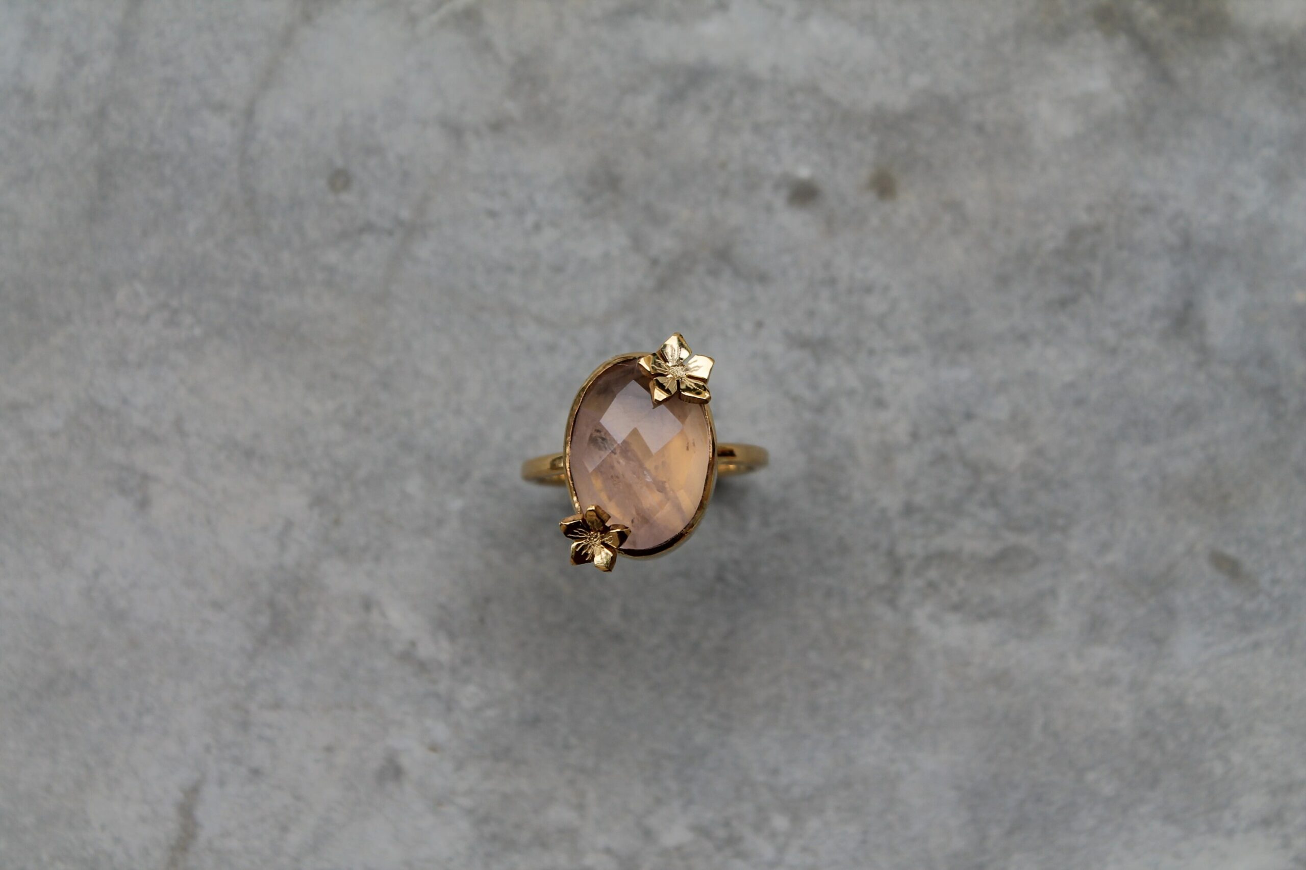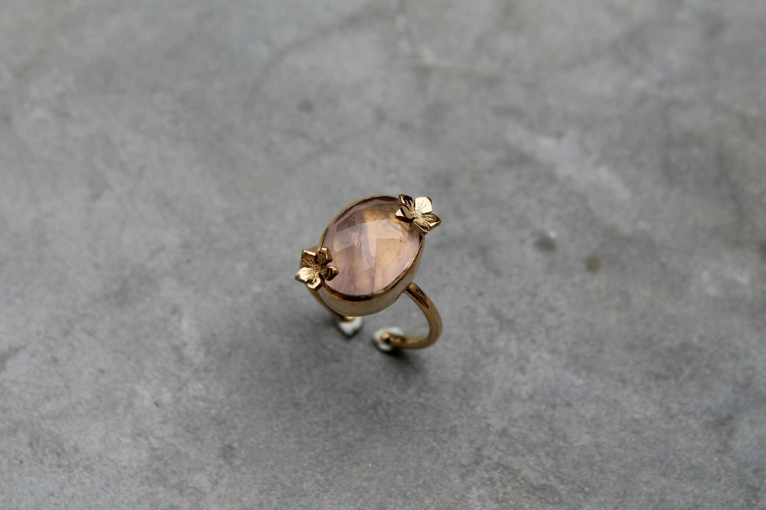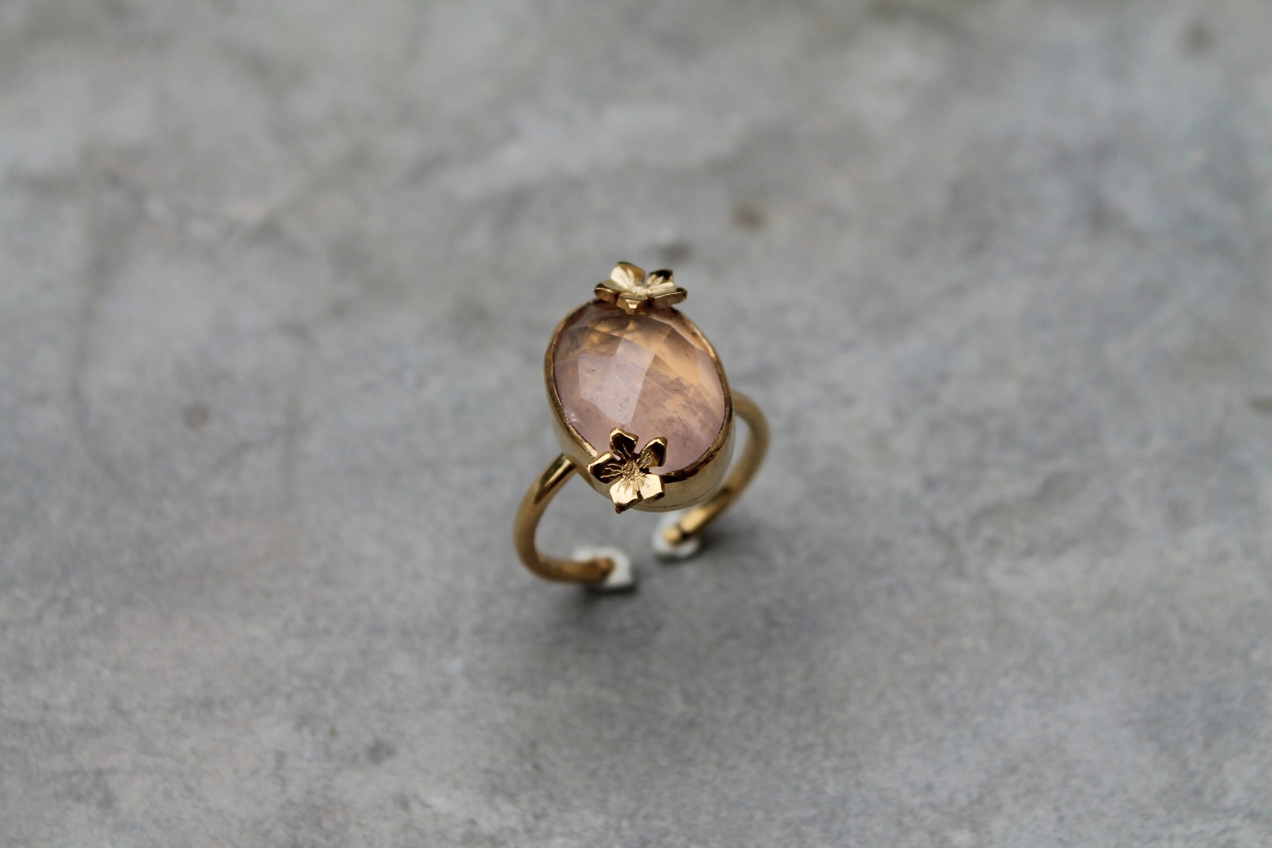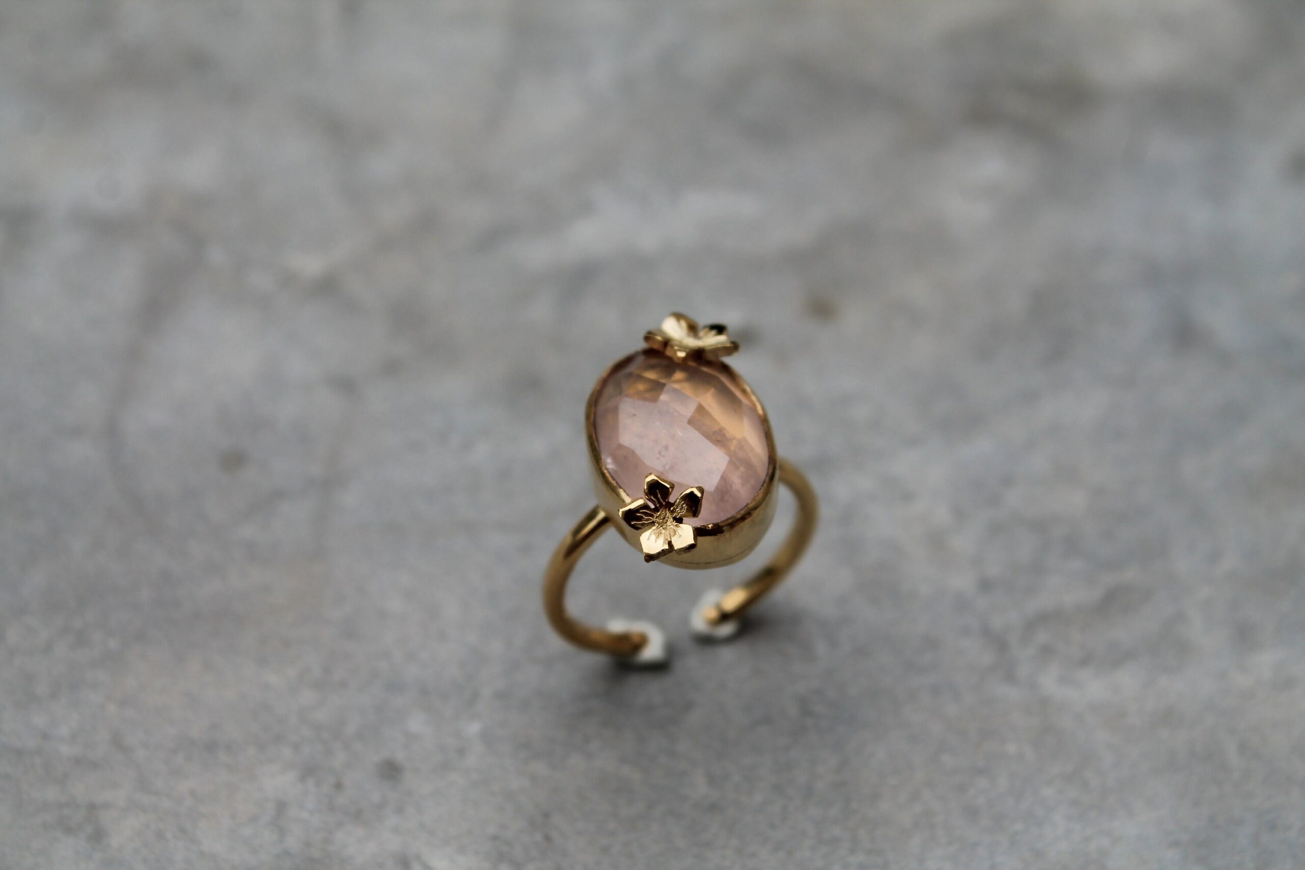 Bague réglable plaquée or sertie d’un beau quartz rose facetté orné de deux fleurs gravées