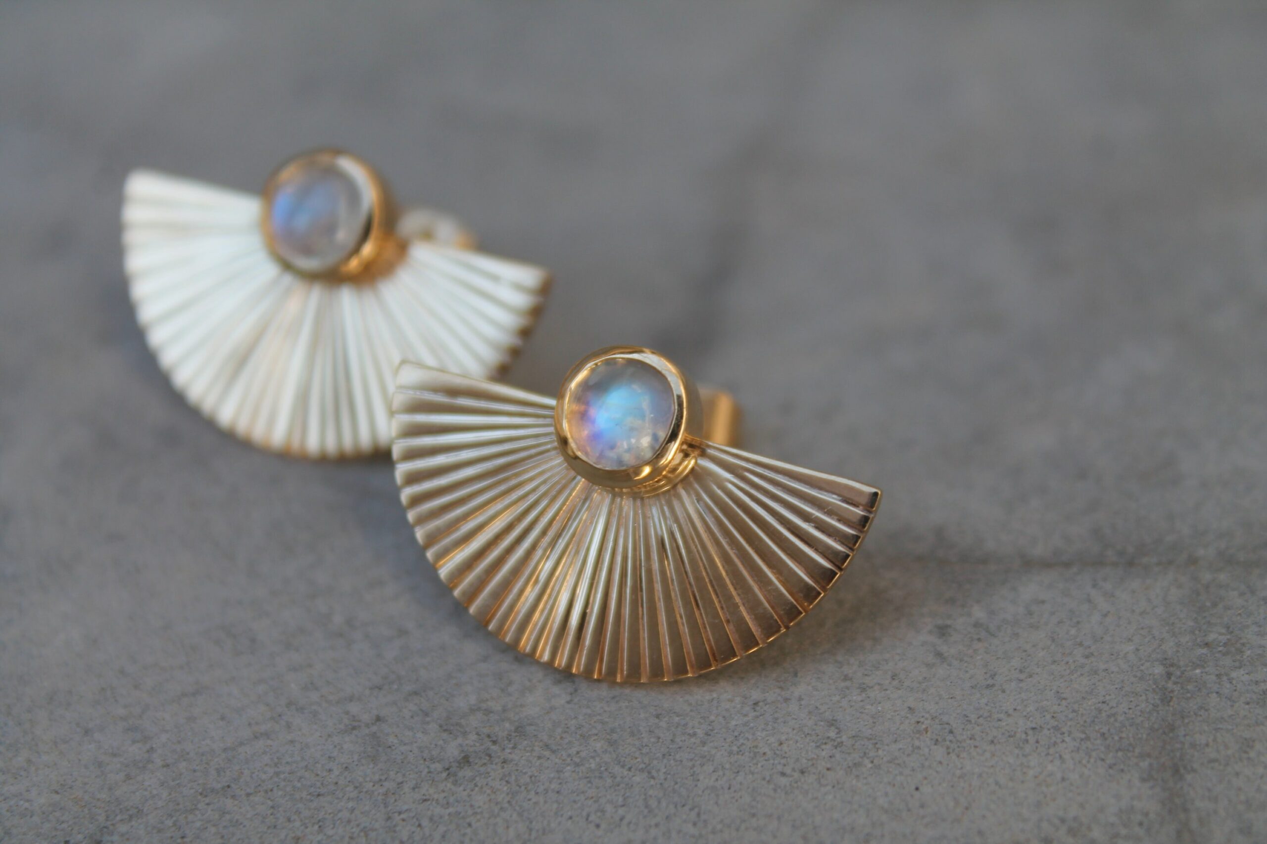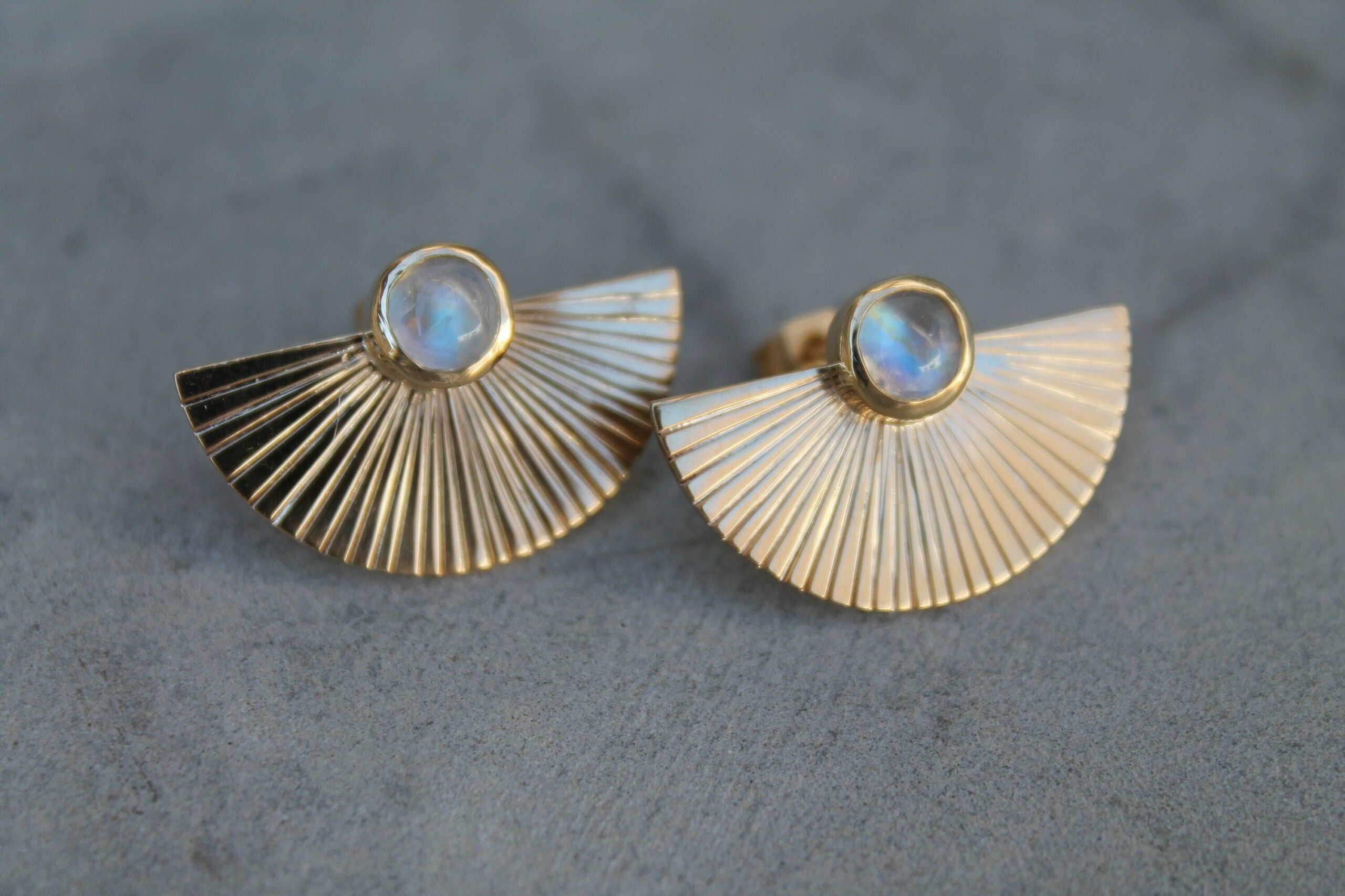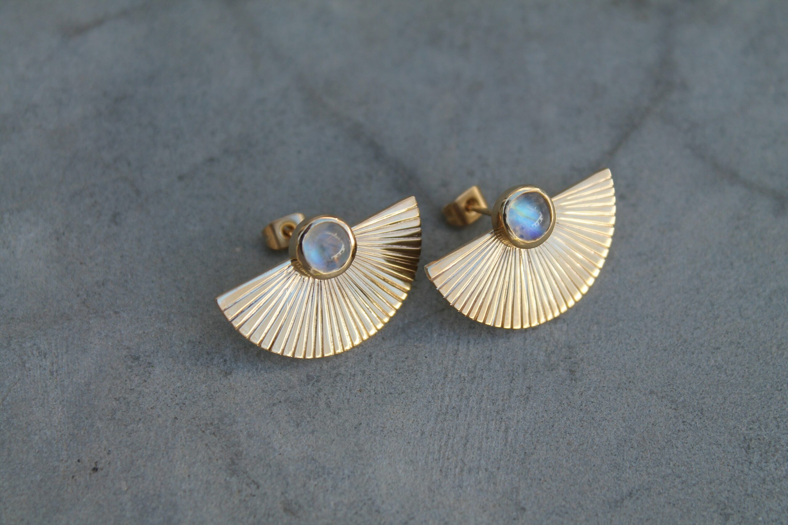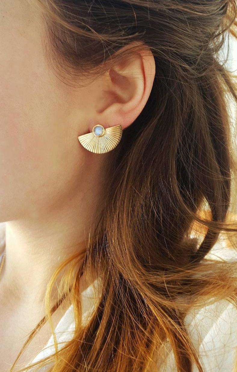 Boucles d’oreilles plaquées or en forme d’éventails serties de deux belles pierres de lune en cabochon