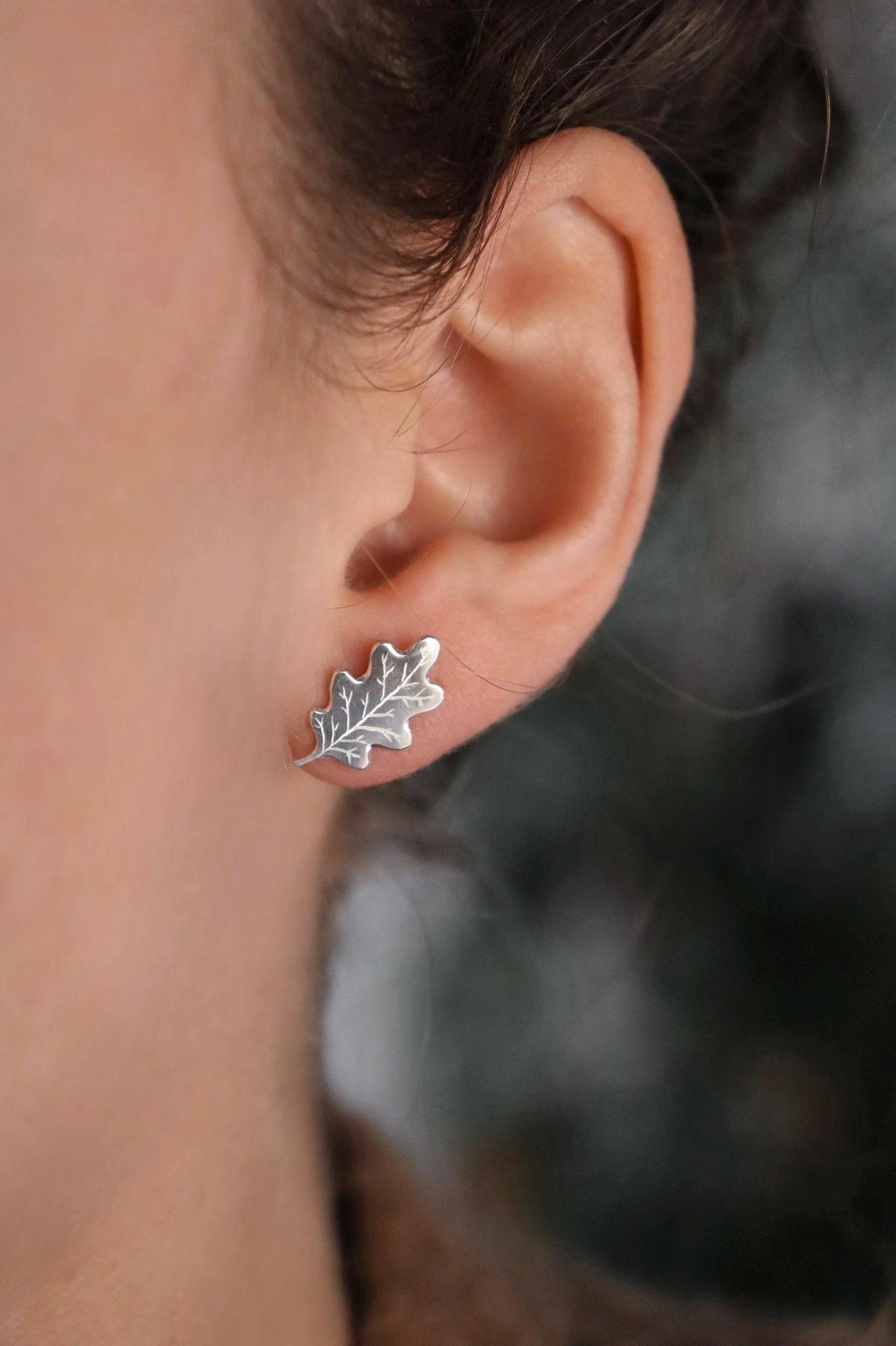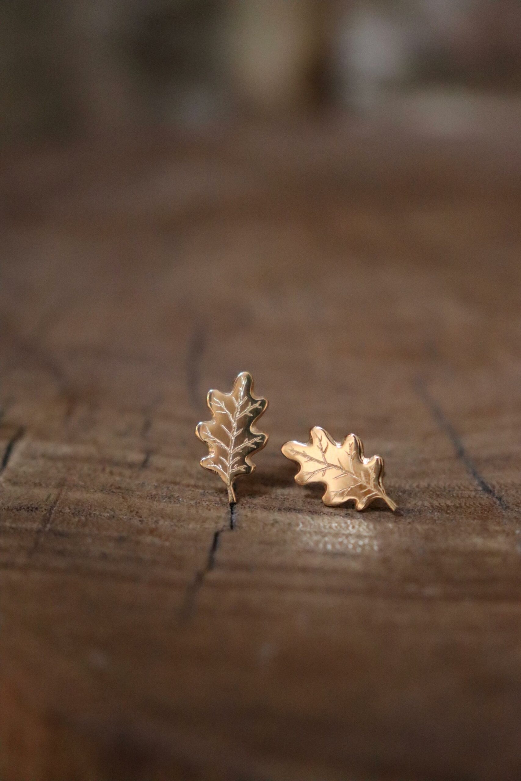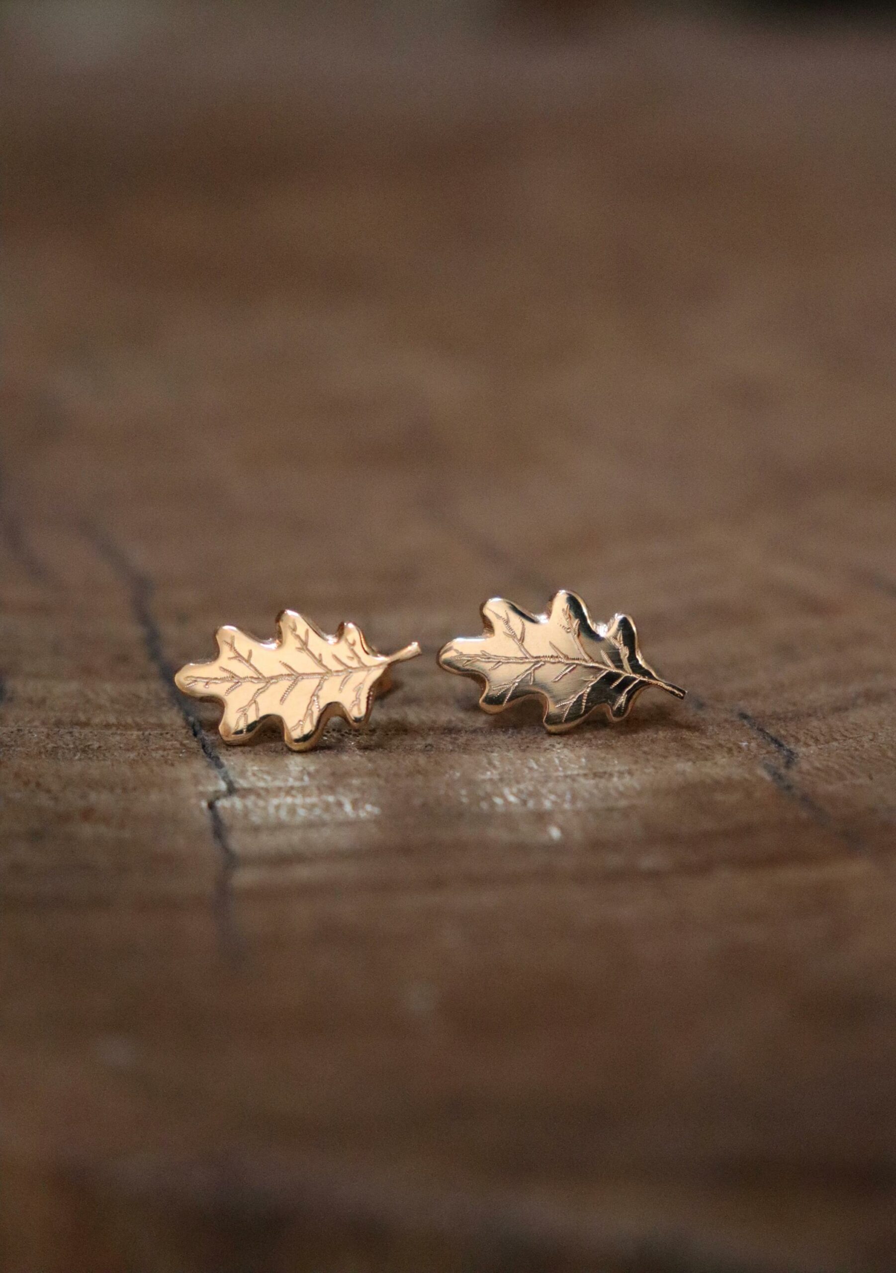 Boucles d’oreilles ornées de feuilles d’érable gravées, disponibles également en miniatures. Entièrement fabriquées à la main