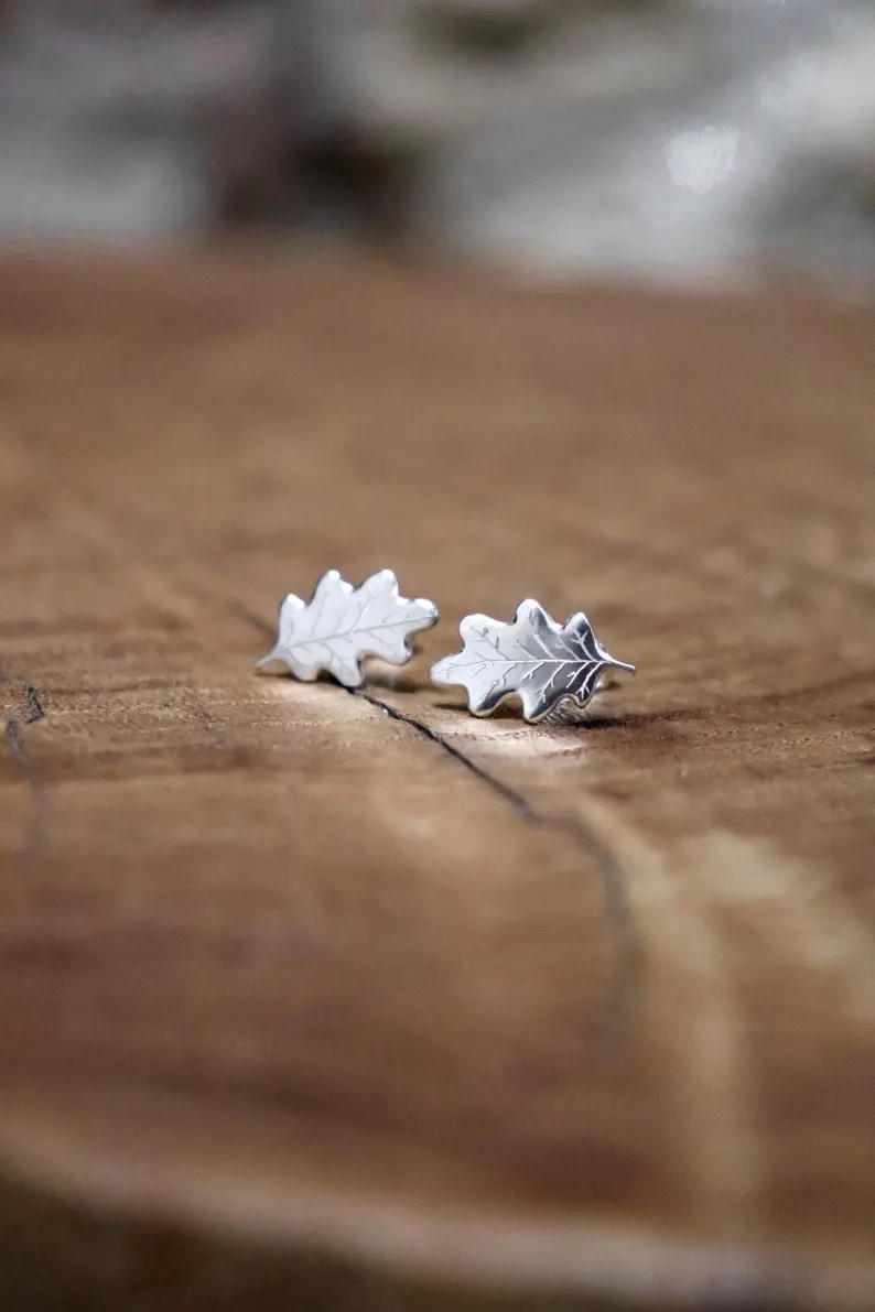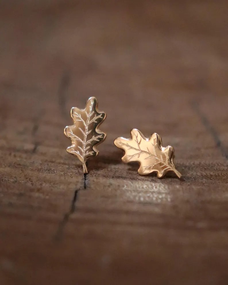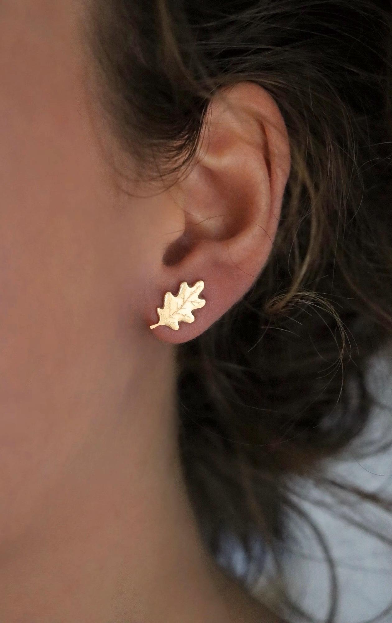 Boucles d’oreilles ornées de feuilles d’érable gravées, disponibles également en miniatures. Entièrement fabriquées à la main