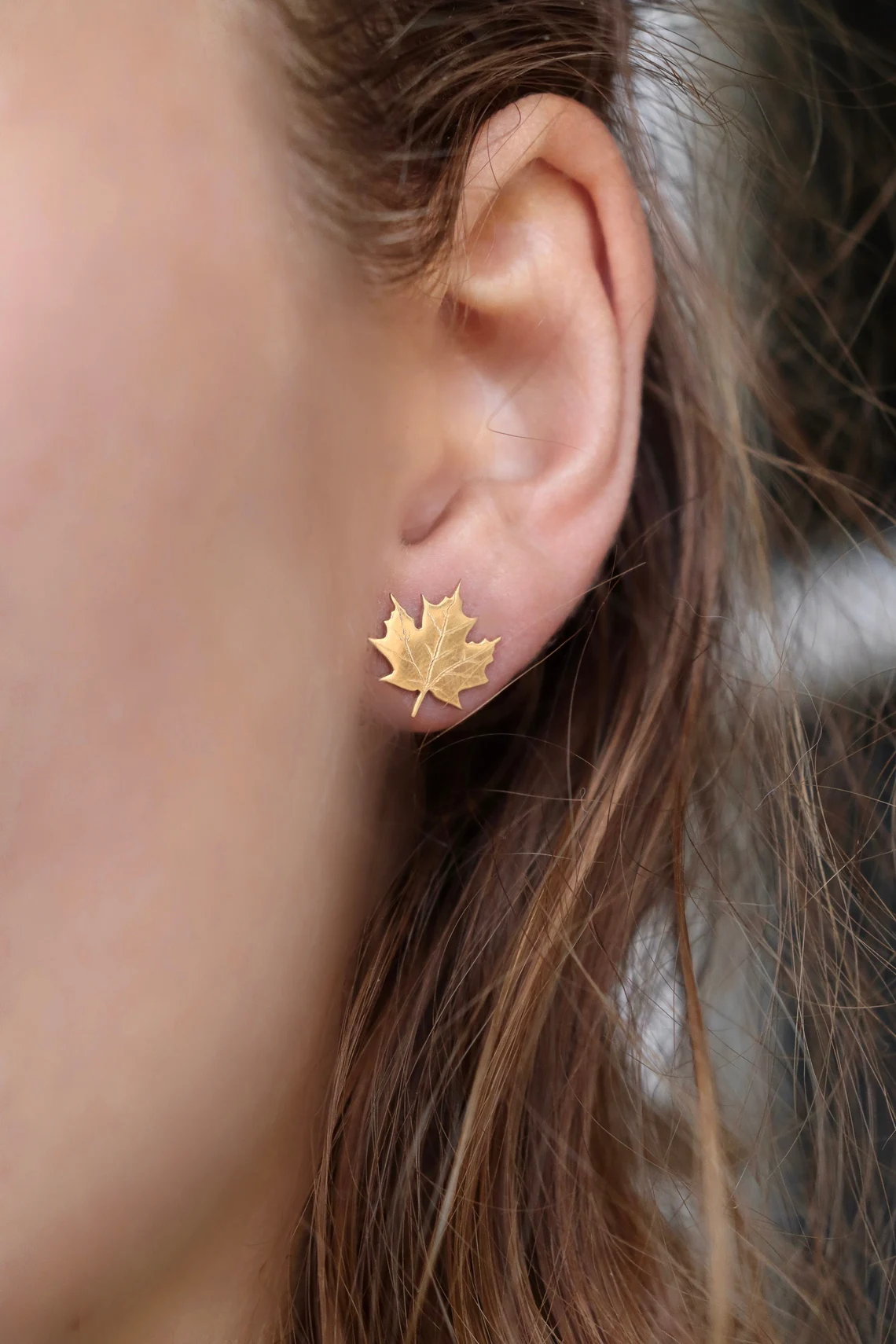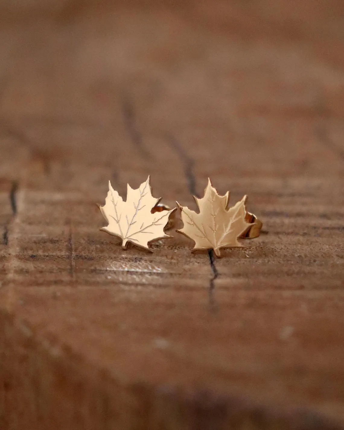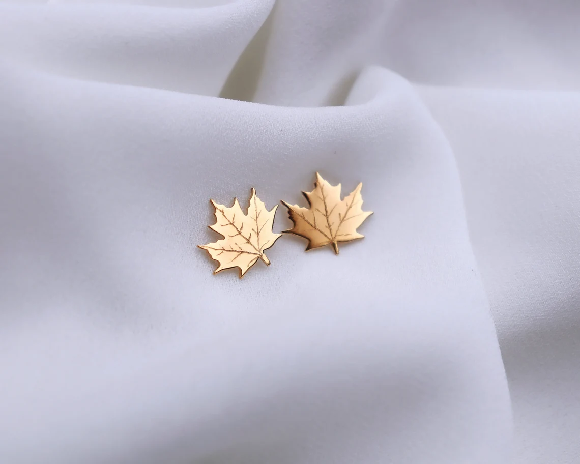 Boucles d’oreilles plaquées or ornées de feuilles d’érable gravées, disponibles également en miniatures.