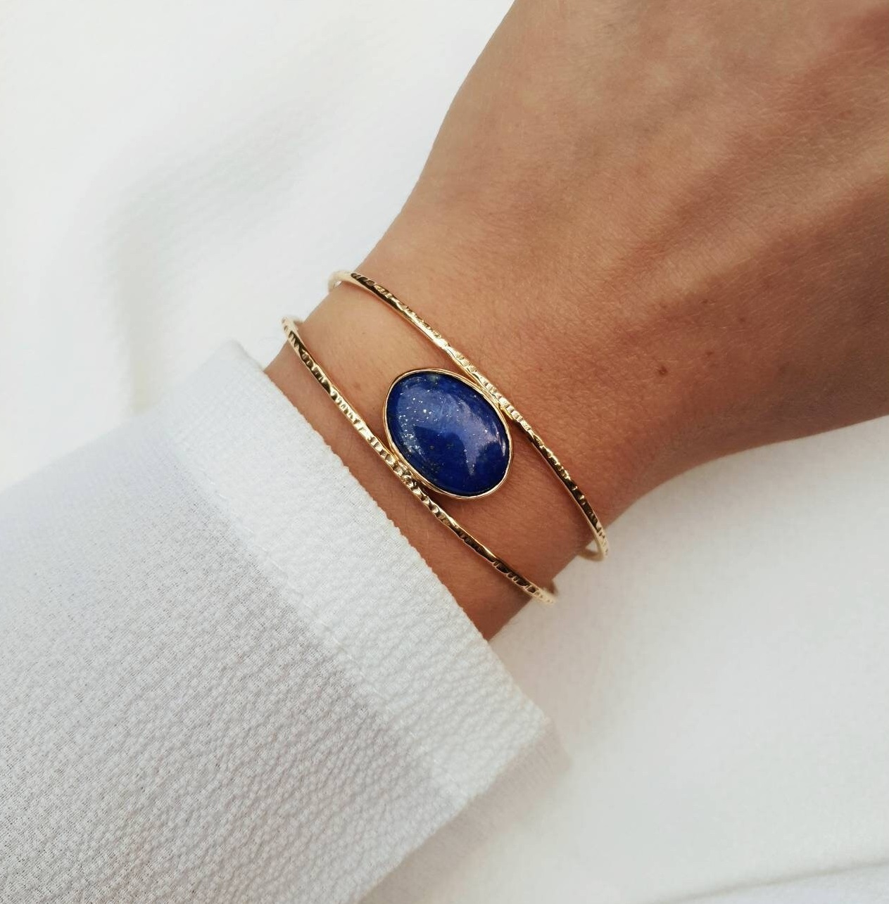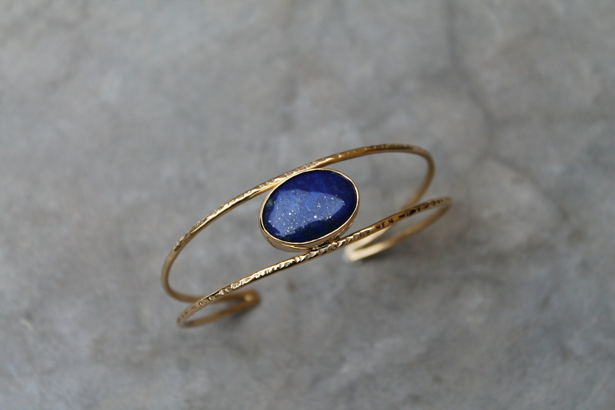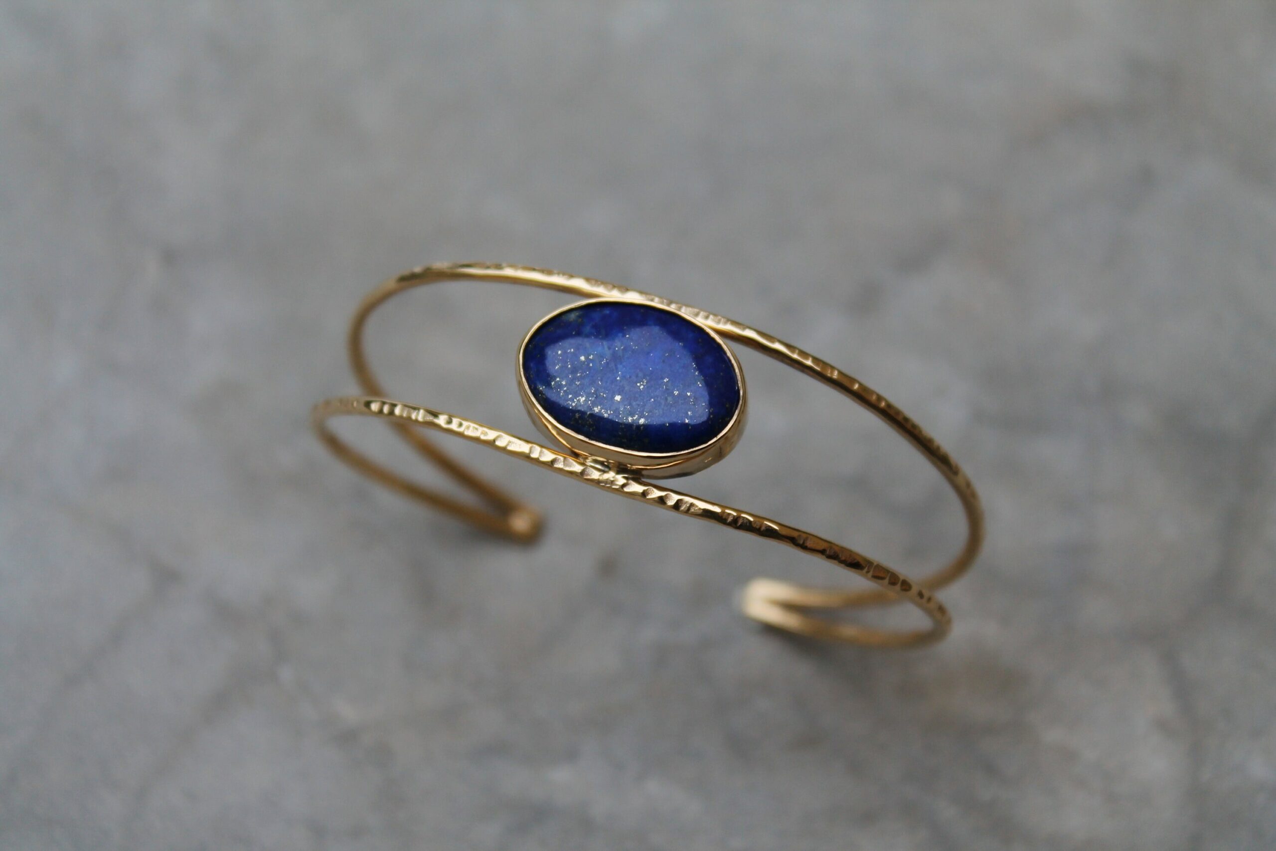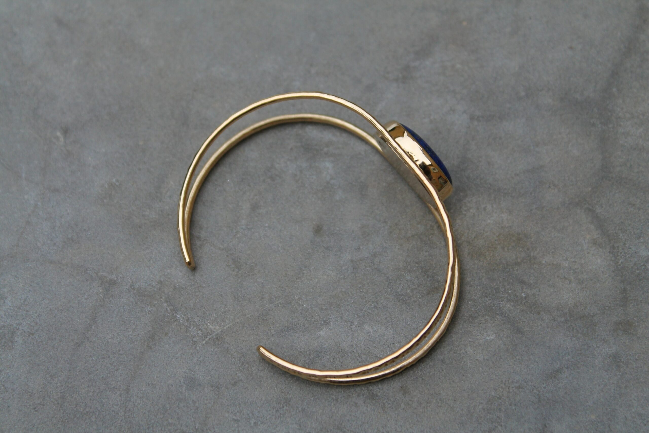 Bracelet réglable plaqué or et martelé serti d’un beau lapis lazuli en cabochon