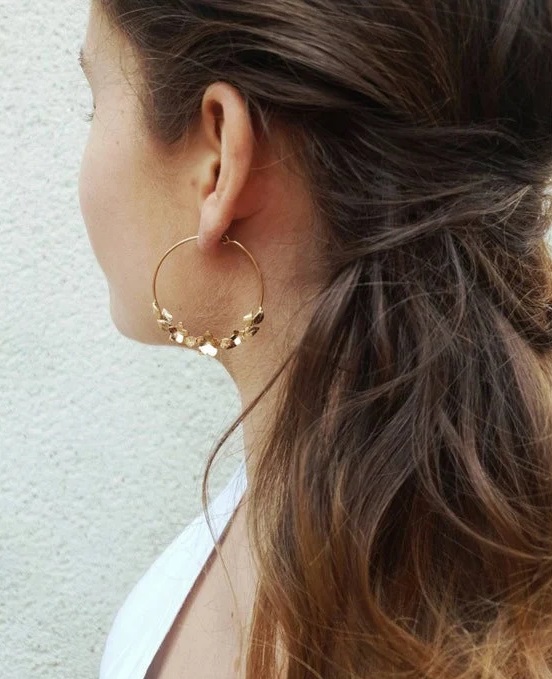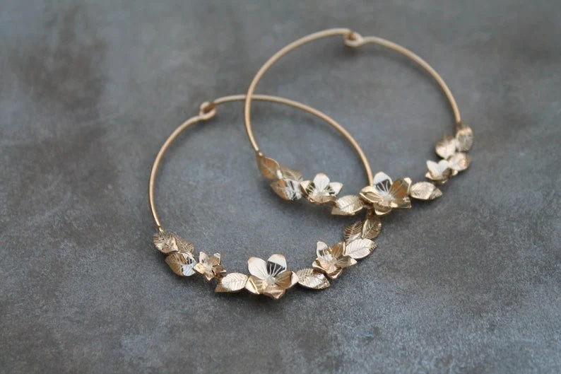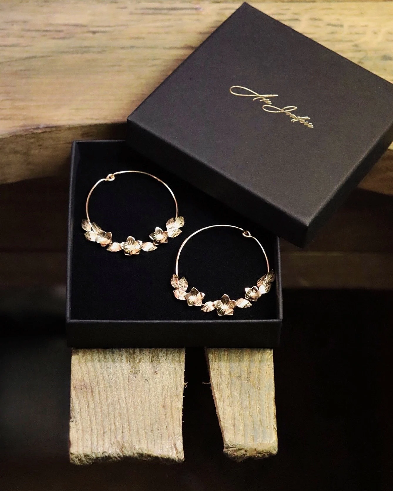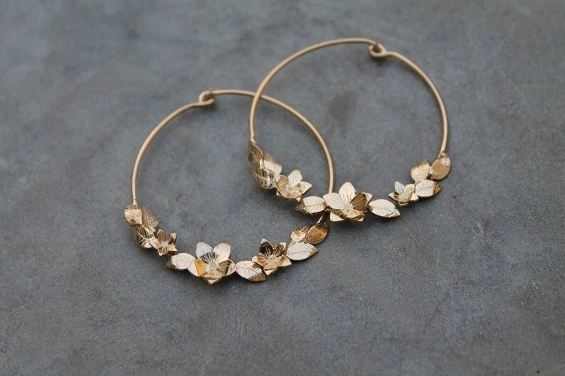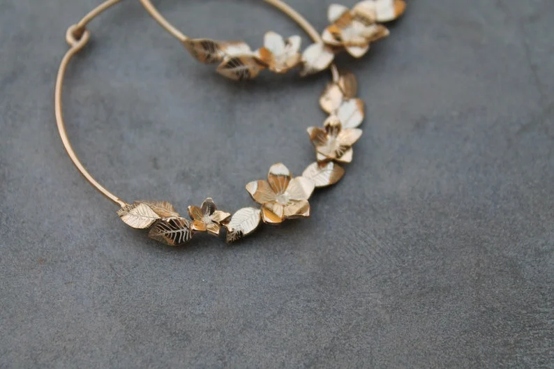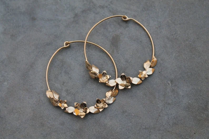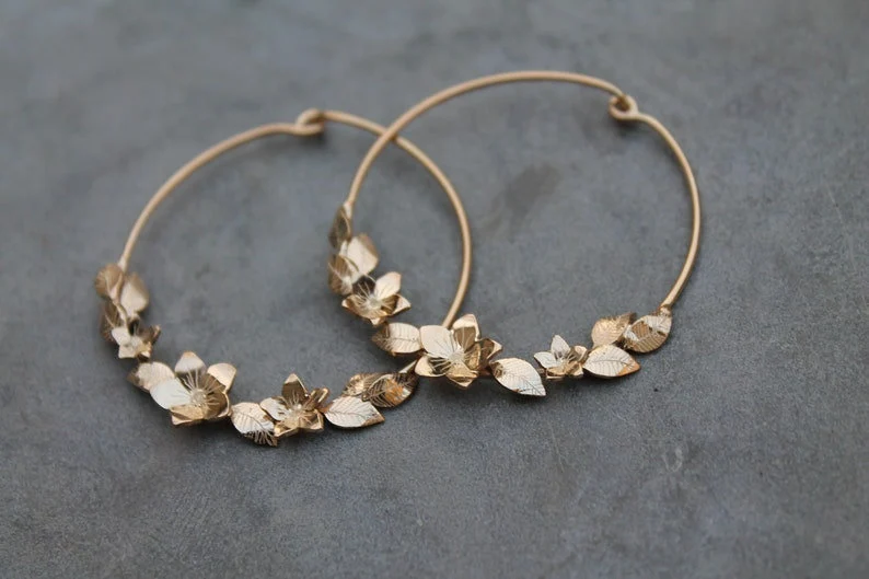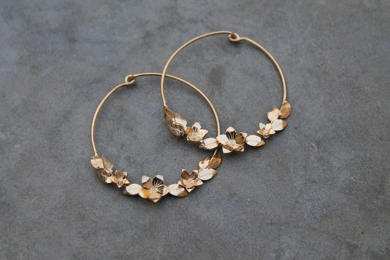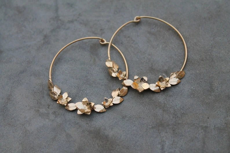 Boucles d’oreilles plaquée or ornées de fleurs et de feuilles gravées