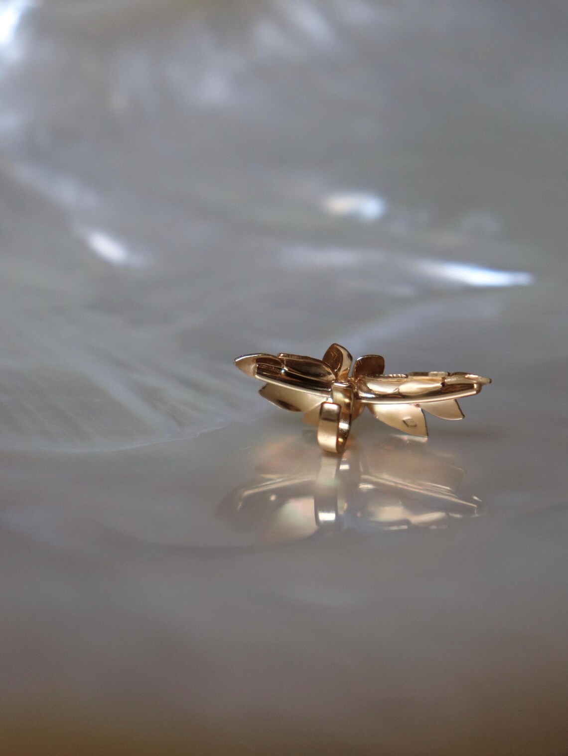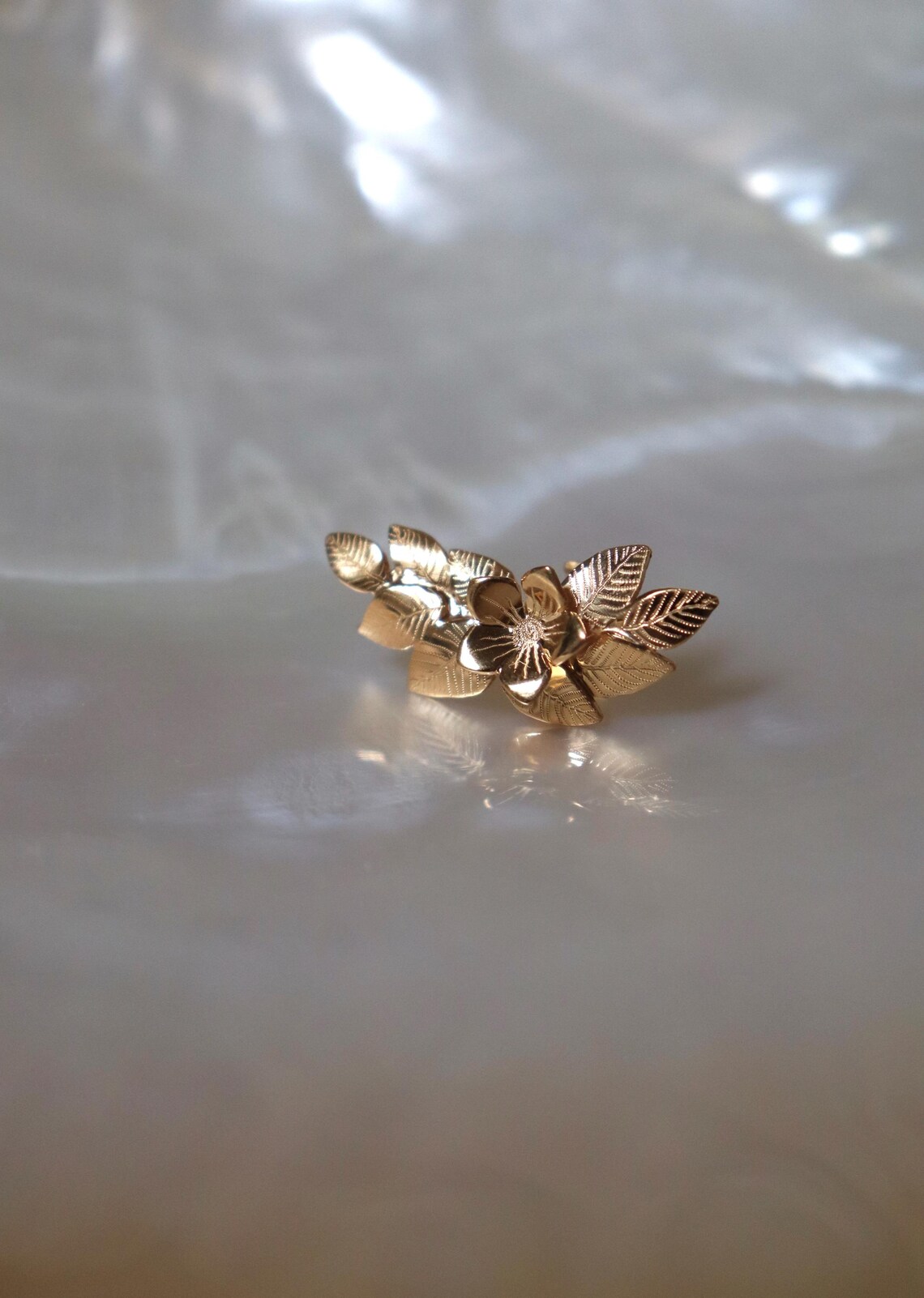 Bijou d’oreille plaqué or orné d’une fleur et de feuilles gravées, chaque pièce est entièrement fabriquée à la main, la forme/l’emplacement/la taille des feuilles peuvent varier légèrement.