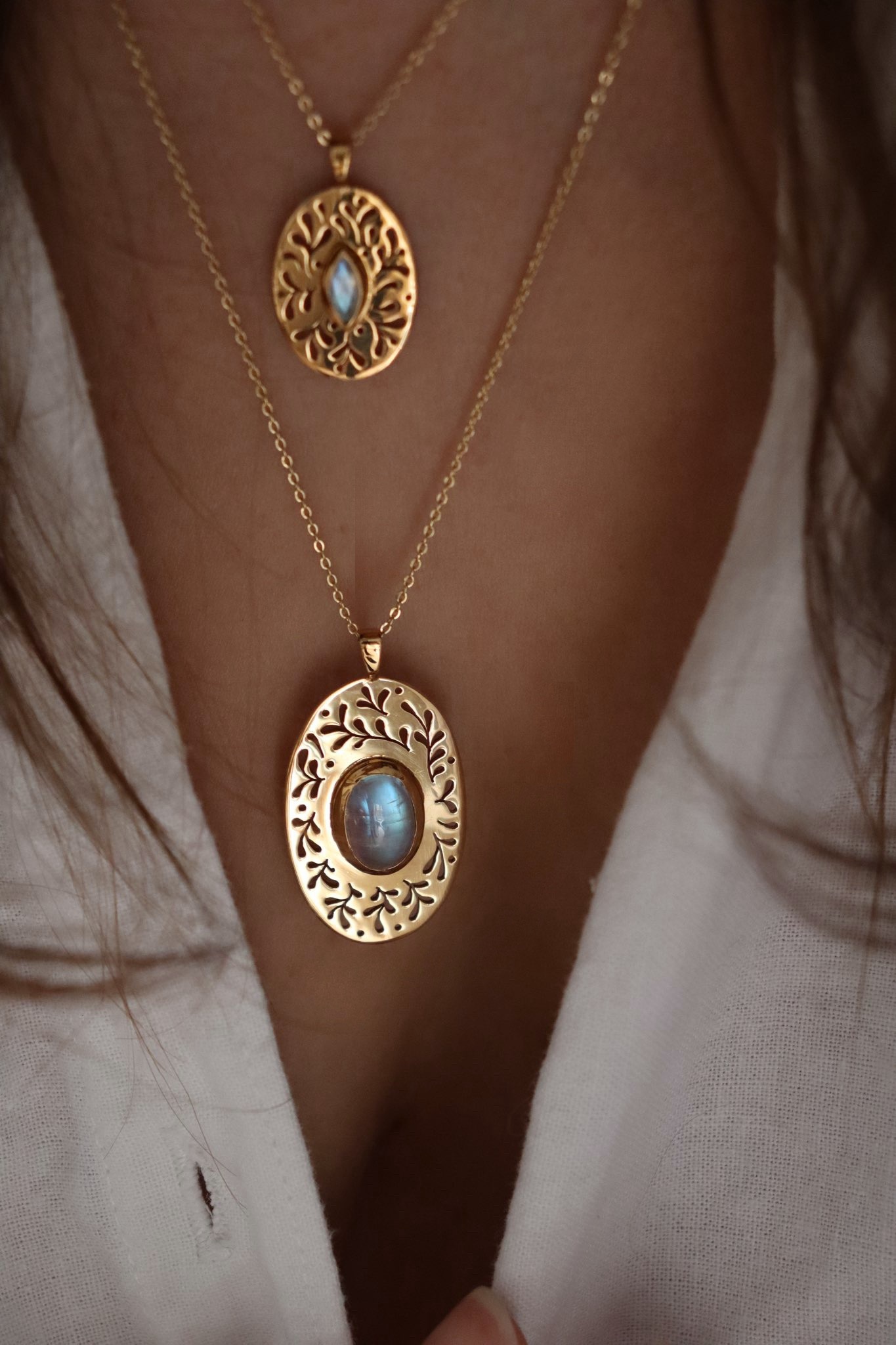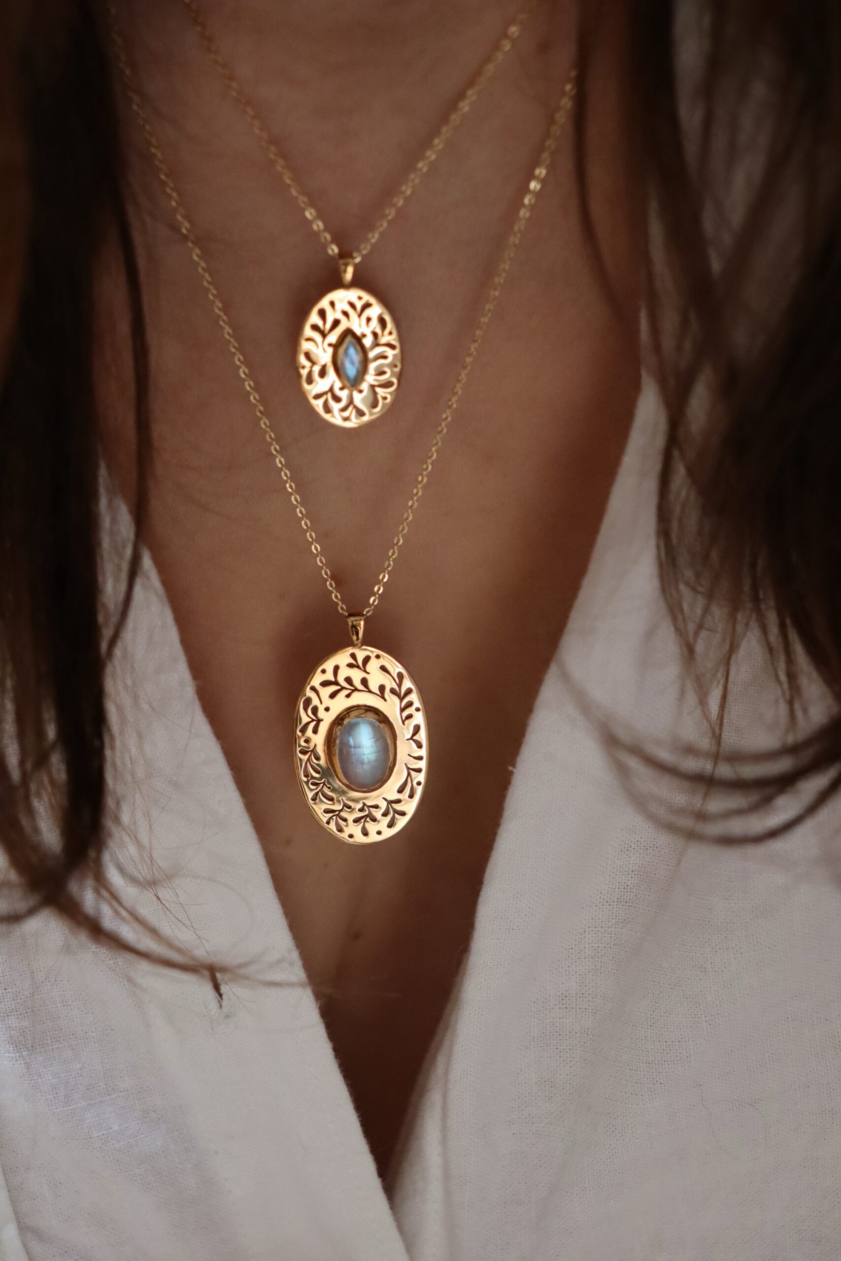 Grand pendentif plaqué or ajouré de motifs végétaux et serti d’une jolie pierre de lune taillée.