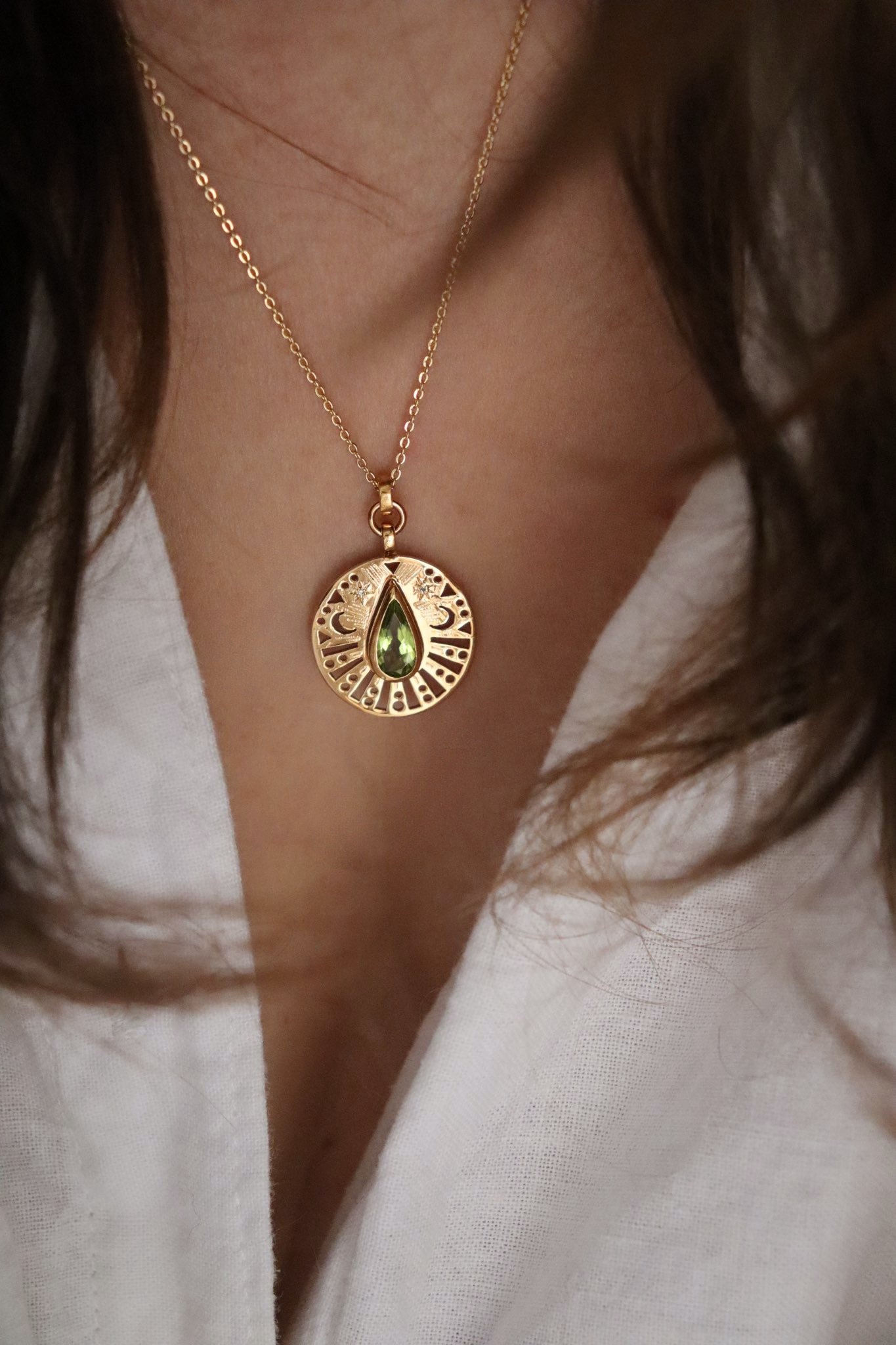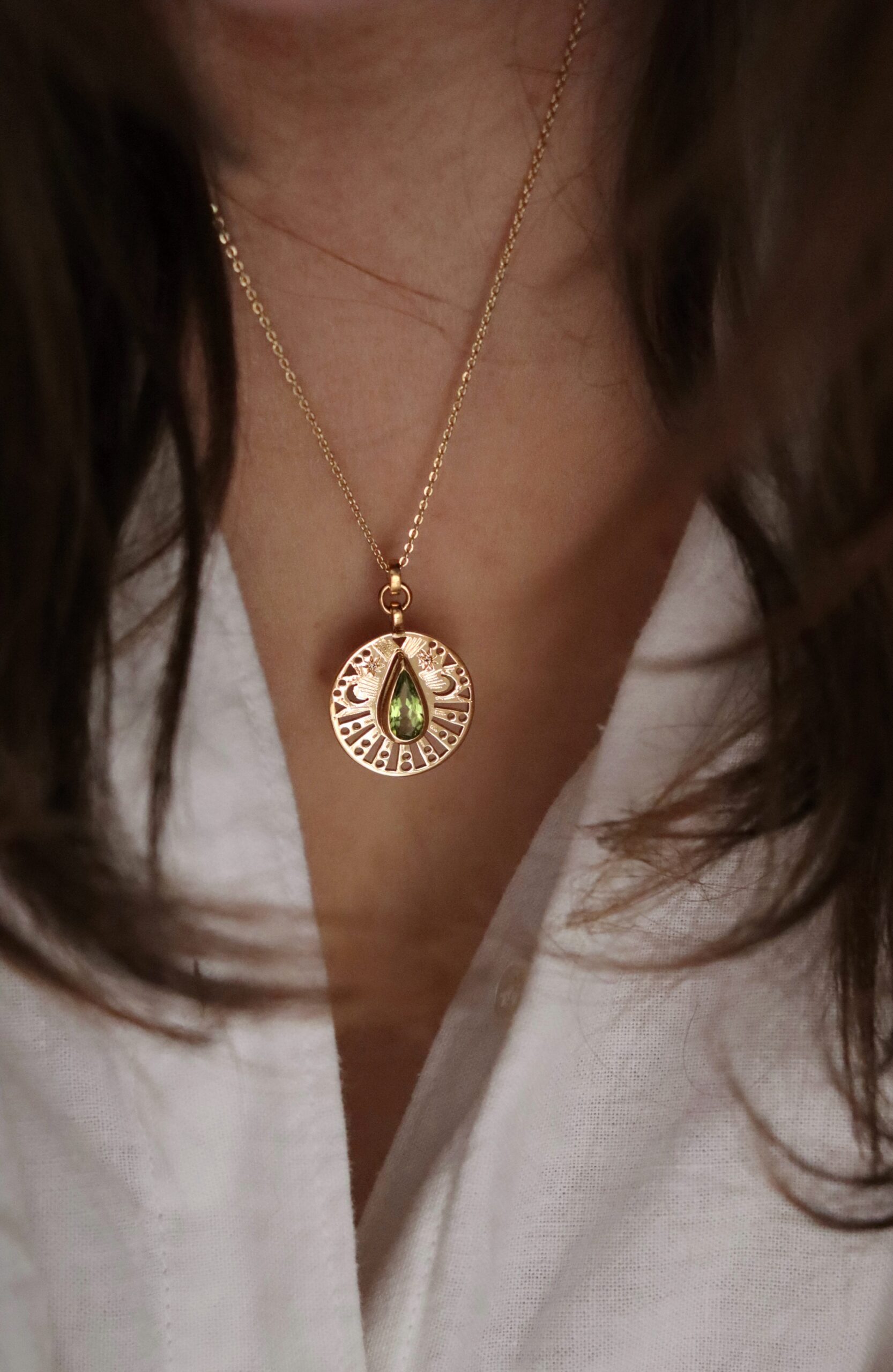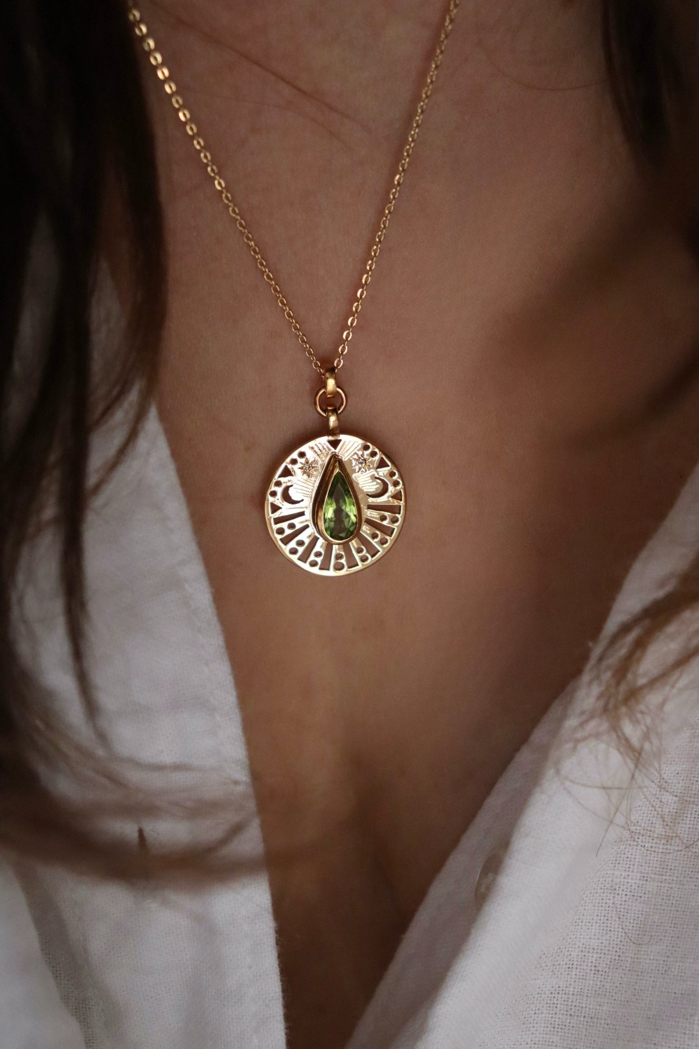 Pendentif ajouré et gravé, plaqué or serti d’un beau péridot taillé et d’oxydes de zirconium.