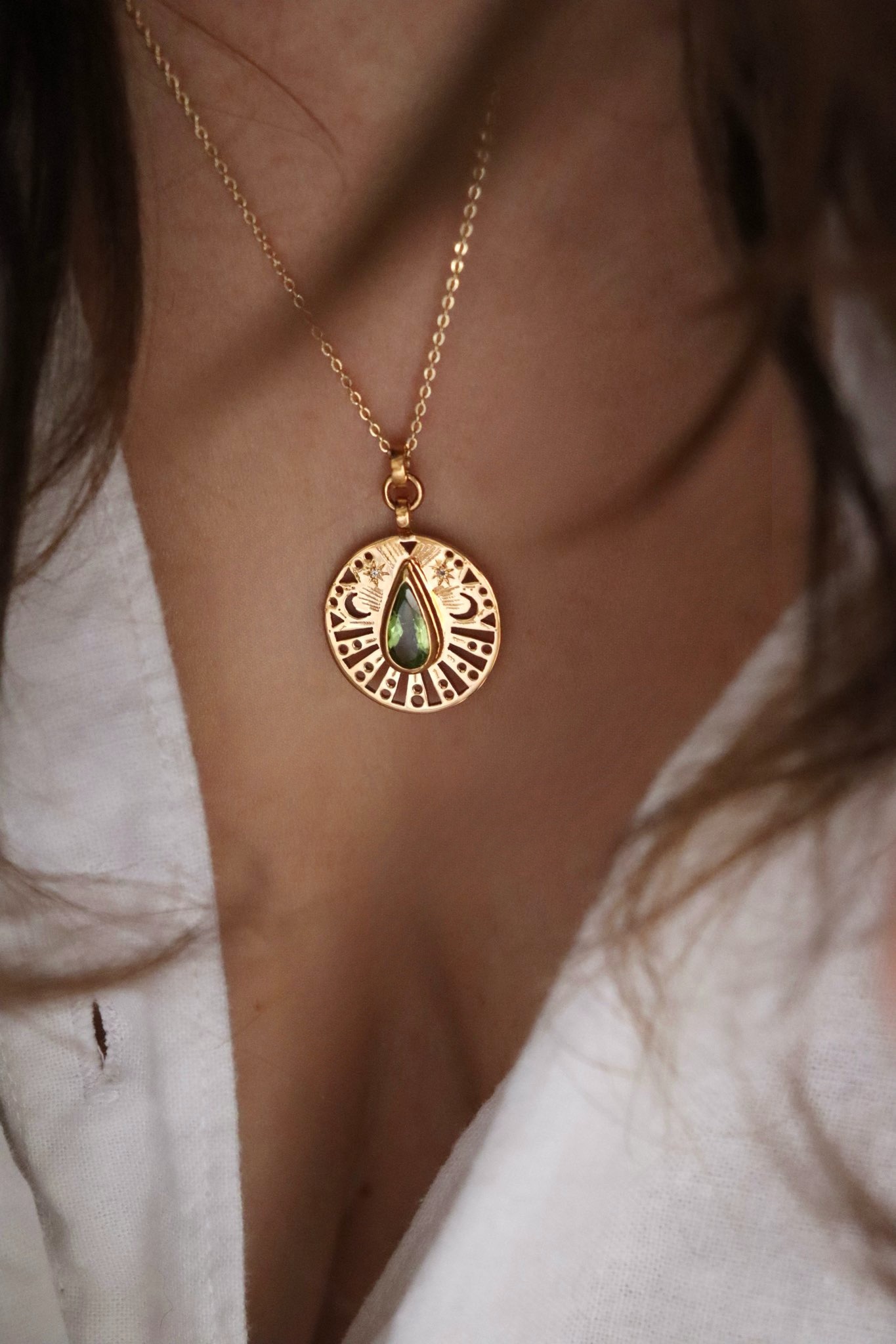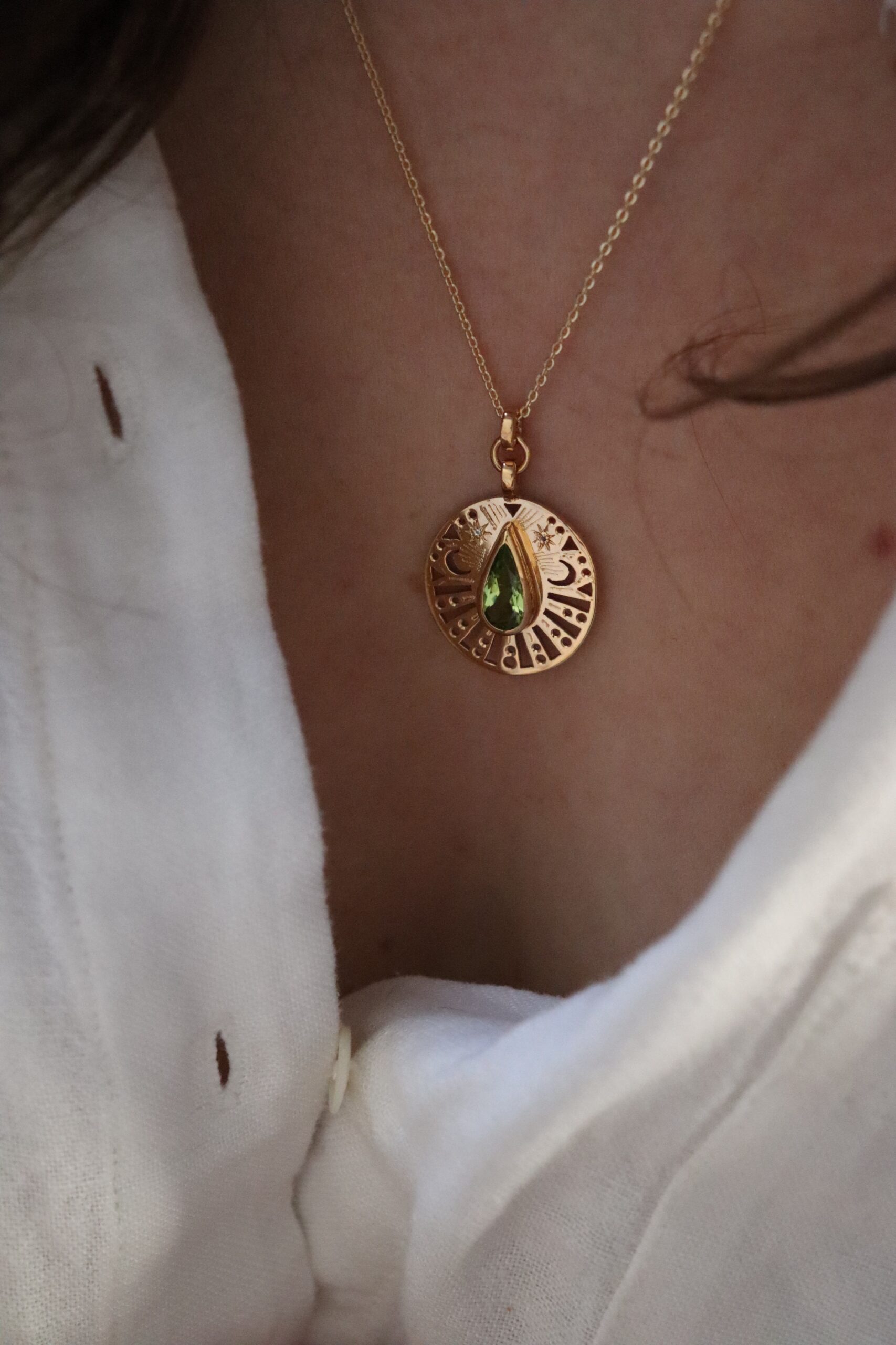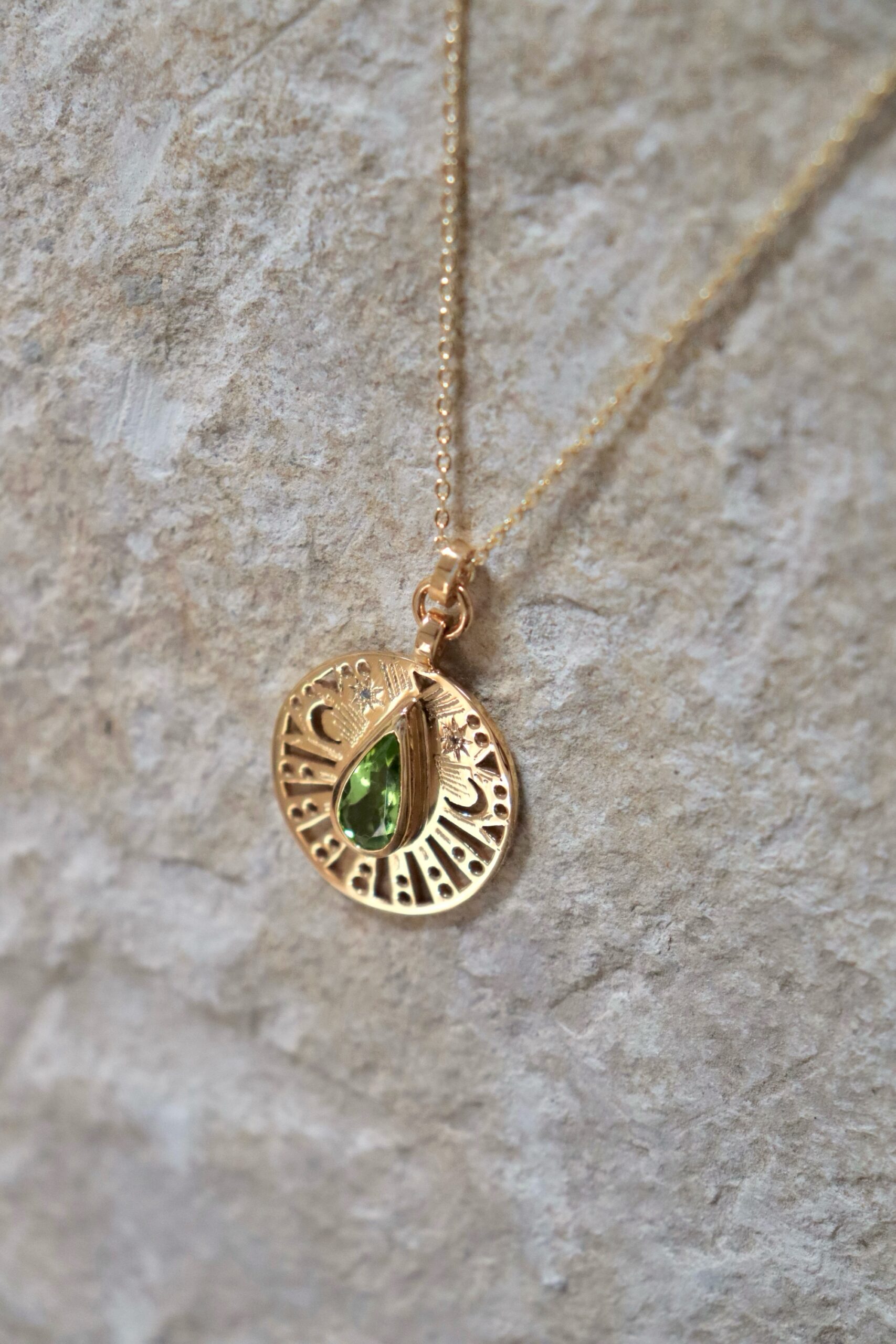 Pendentif ajouré et gravé, plaqué or serti d’un beau péridot taillé et d’oxydes de zirconium.